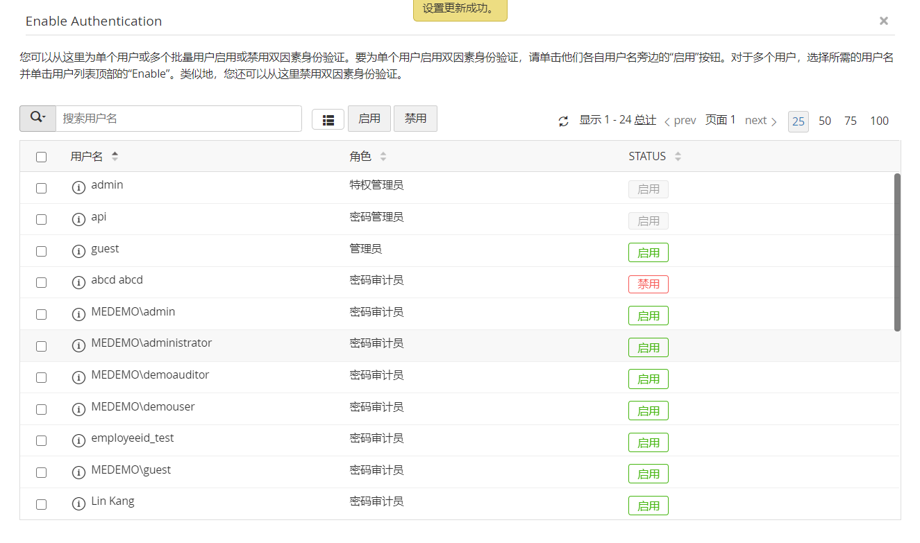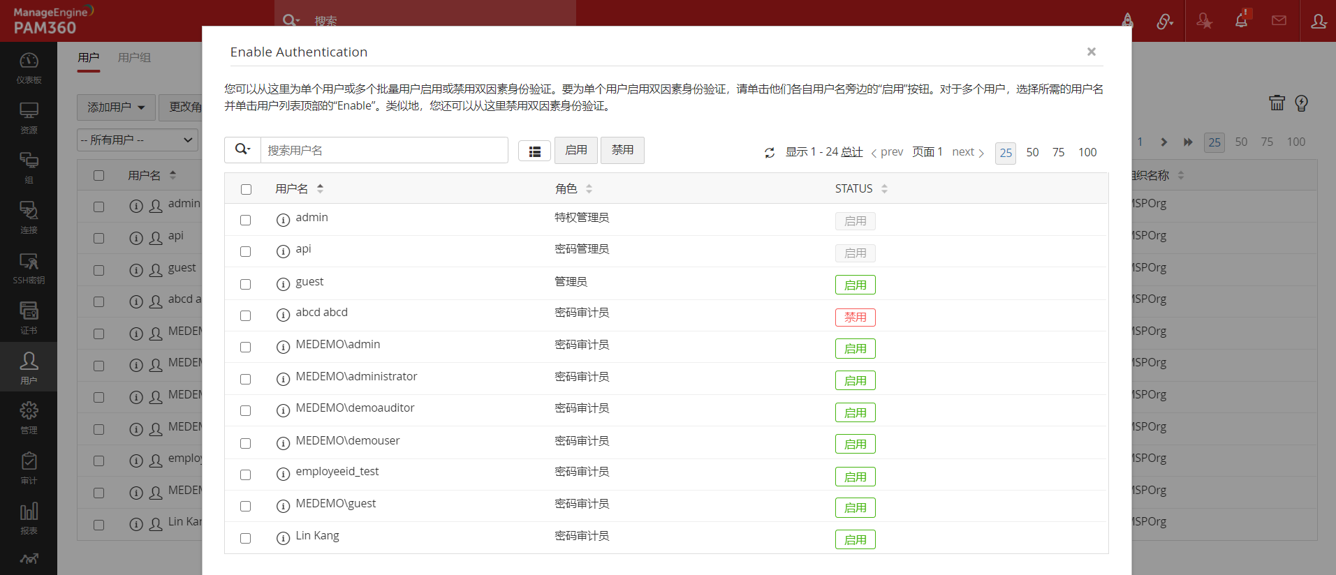 - 您可为单个用户或批量为多个用户启用或禁用双因素验证。 为单个用户启用双因素验证,请单击相应用户名旁边的启用。 为多个用户启用,请选择所需的用户名,然后点击用户列表顶部的启用。 类似的,您也可以禁用双因素验证。