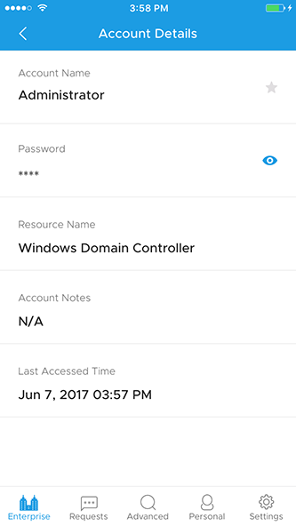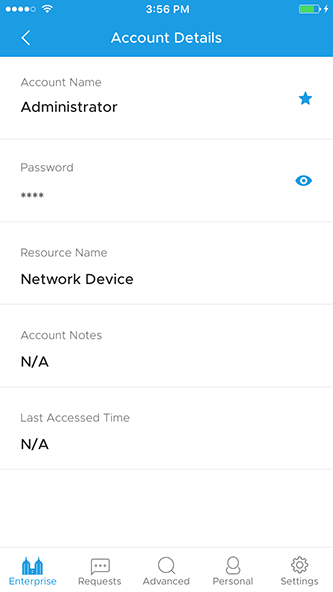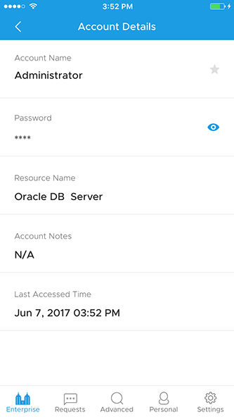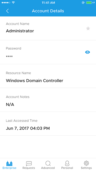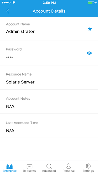 - 单击任何帐户将帮助你查看帐户详细信息,如密码屏蔽为星号,资源名称,帐户笔记和上次访问的时间。