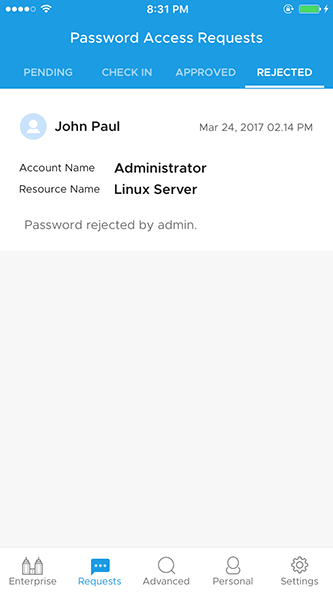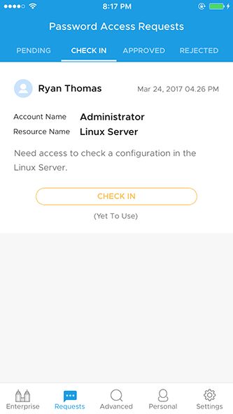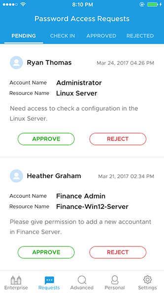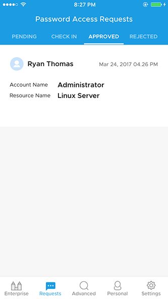 - 通过交换屏幕,您还可以查看正在使用的密码列表、要签入的密码、以前审批和拒绝的请求。