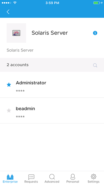 - 单击任何帐户即可帮助您查看掩蔽为星号、资源名称、帐户名称和上次访问时间的密码。