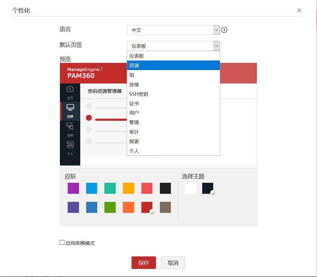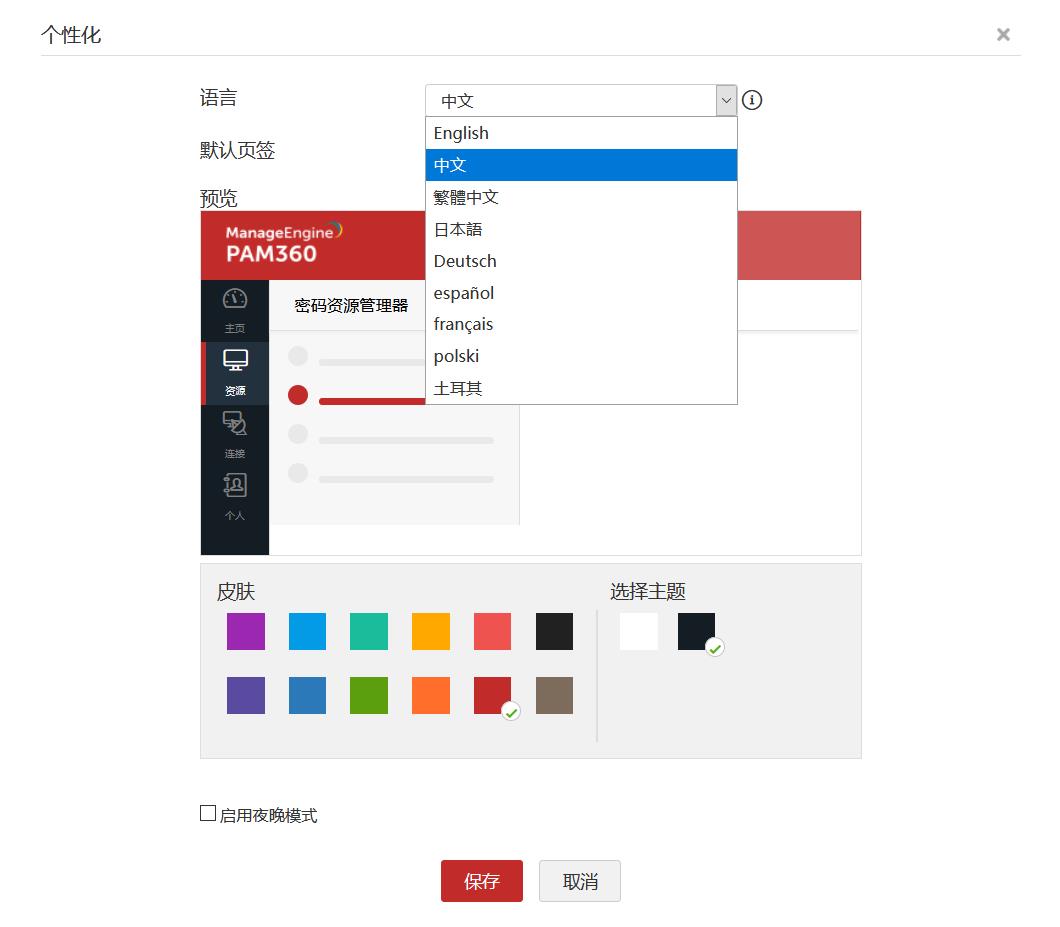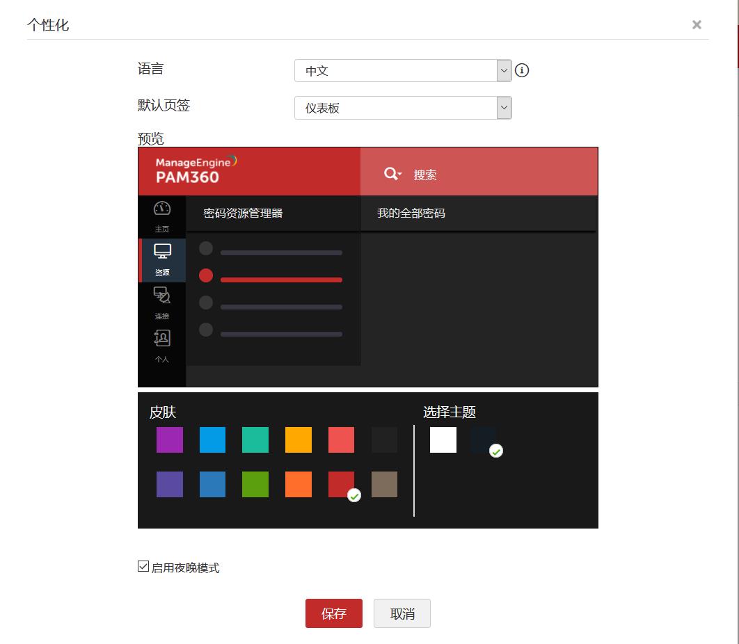 PAM360 允许其用户个性化其 PAM360 帐户的显示设置。 用户可以从选项列表中选择系统的语言、启用夜间模式以及设置系统的主题和背景颜色。