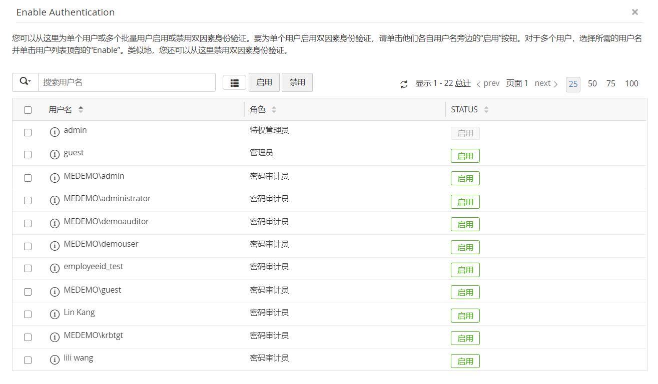 - 您可以批量启用或禁用单个用户或多个用户的双因素验证。若要为单个用户启用双因素验证,请单击用户名旁边的“启用”按钮。对于多个用户,选择所需的用户名,然后点击用户列表顶部的“启用”按钮,同样,您也可以从这里“禁用”双因素验证。