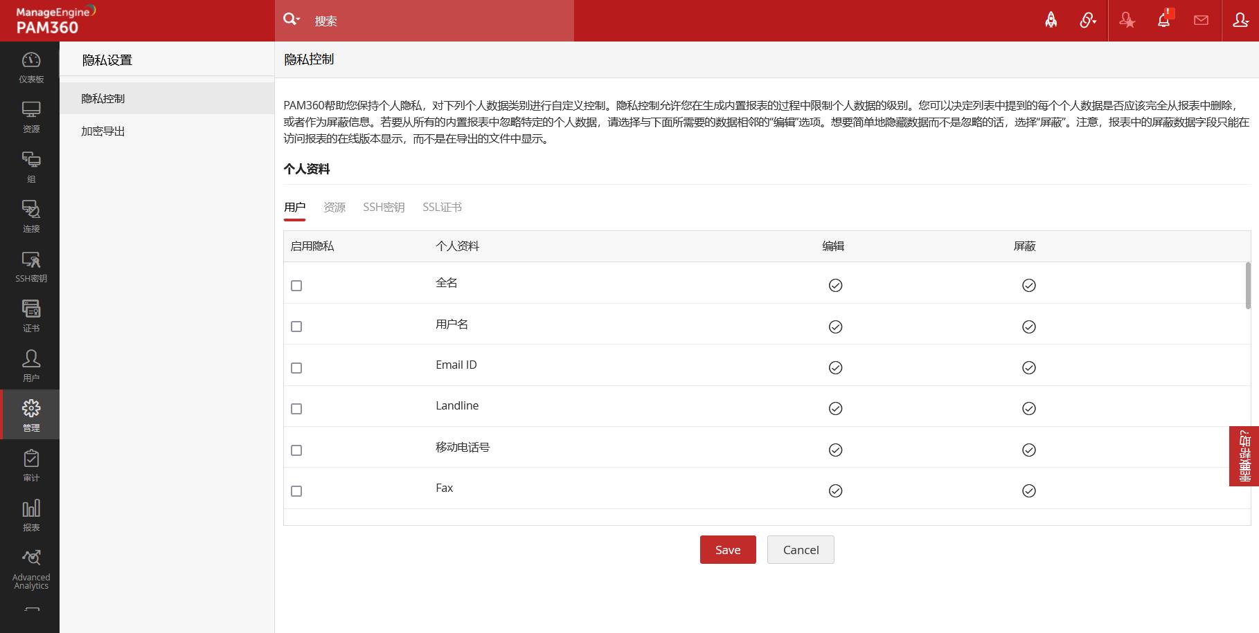 为了增强产品的隐私, PAM360 可为您定制和控制在内置报表生成流程中包含个人数据。 内置报表是 PAM360 生成的预格式化报表,可供用户用于可视化分析。 您可以决定 PAM360 中的每个个人数据输入应作为报表中的掩蔽条目进行,还是从报表中完全删除。