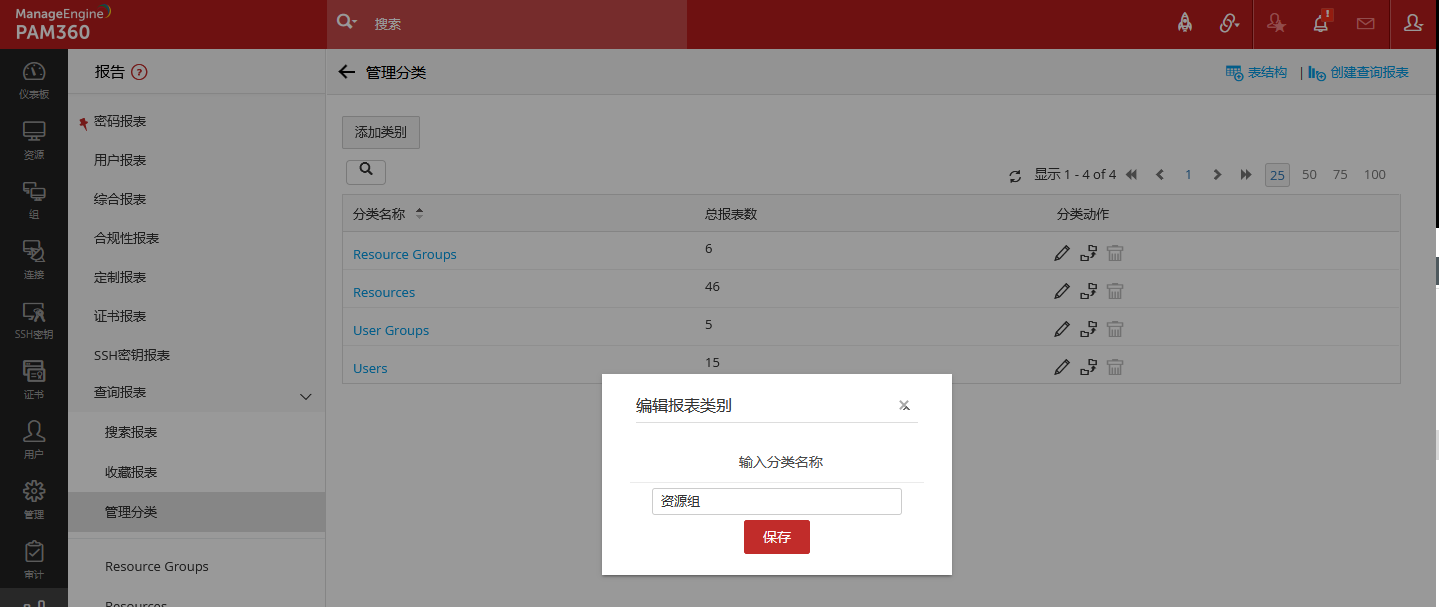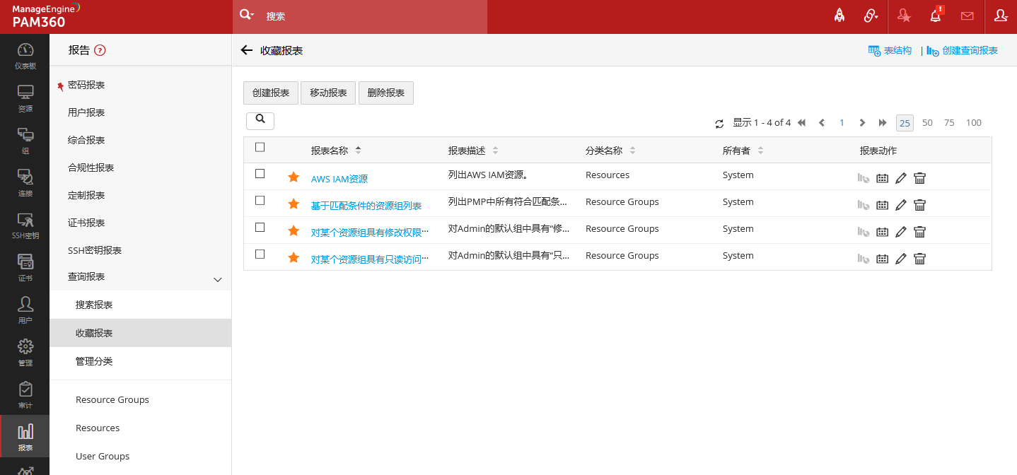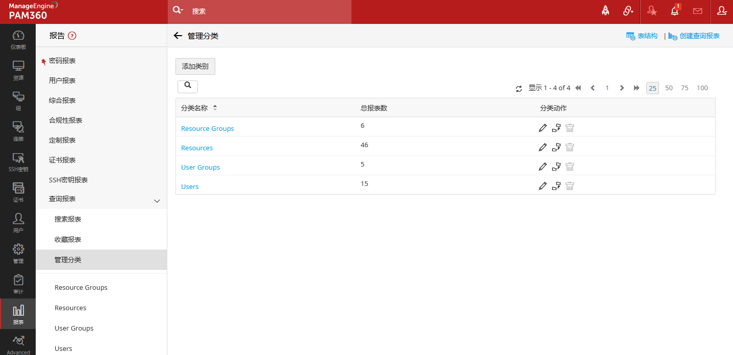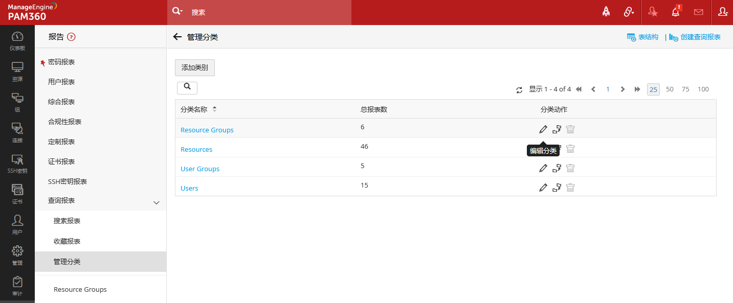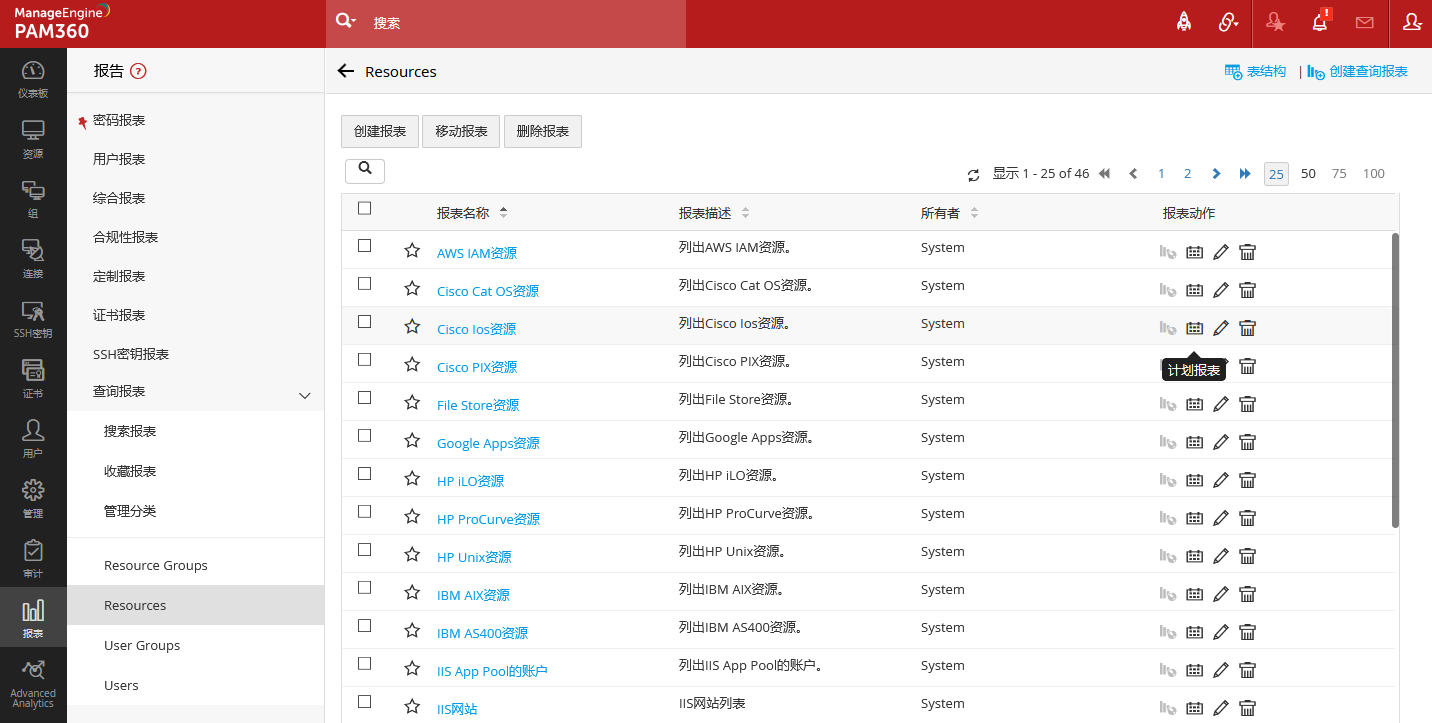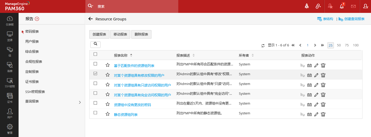 PAM360提供预建的查询报表,分别划分在分类资源组、资源、用户组、用户下,可以直接打开查看,用户也可以通过系统界面提供的表结构说明,编写自定义的SQL语句。