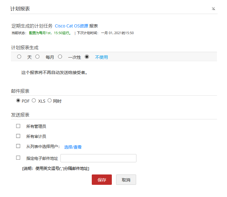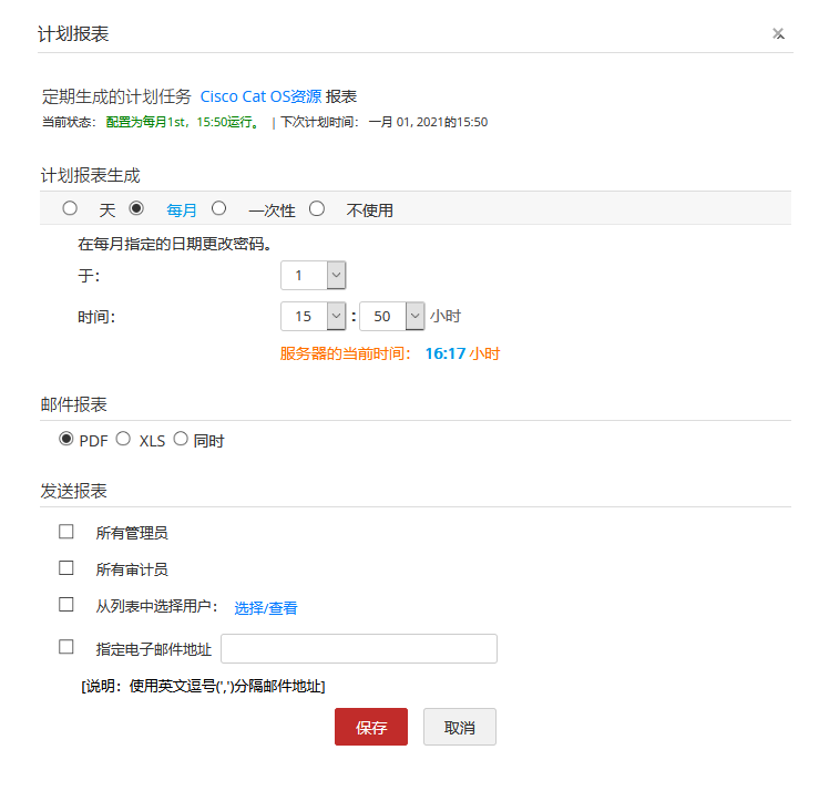 - 设置计划报表的收件人、 以及报表的格式,可以选择PDF 或 XLS 或两者。