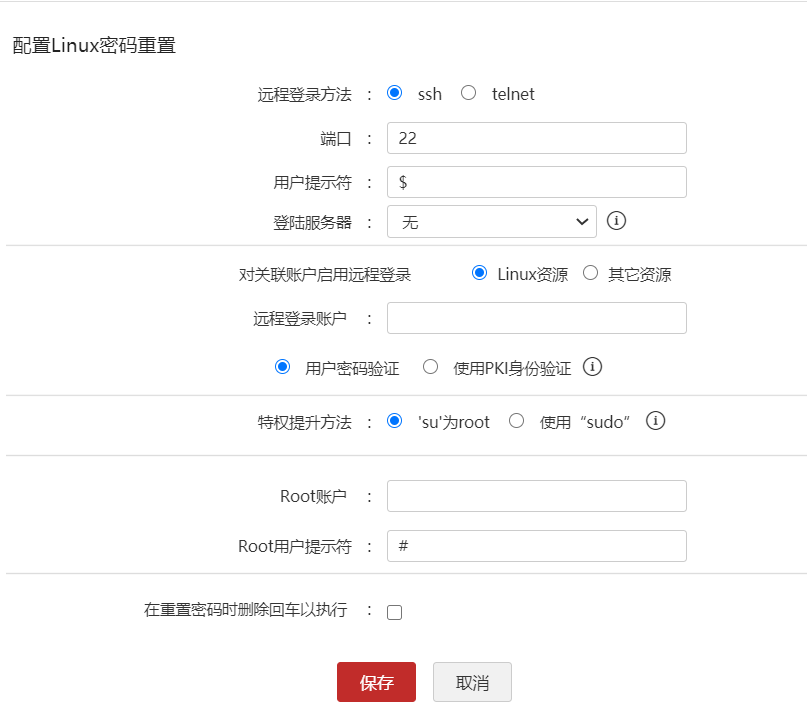 对于Unix资源的远程密码重置,您需要先使用远程登录帐户登录到目标系统,再进行特权提升以实现密码重置。如果目标系统支持通过Sudo执行密码重置命令,您可以使用这里提供的两个选项:使用'su'为root,或者使用'Sudo'执行远程密码重置命令。