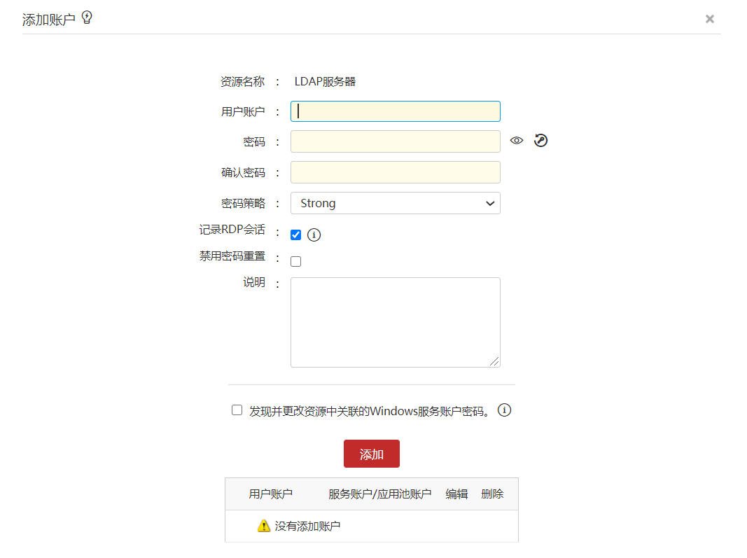 如果您通过无代理模式配置远程密码重置,需要输入用于远程登录到目标资源的帐户。