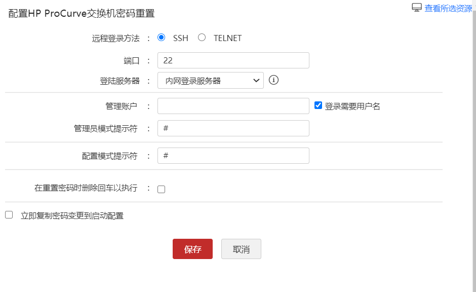 对于HP ProCurve设备,PAM360需要在资源中运行Telnet或SSH服务。配置管理员帐号、管理员模式和配置模式的登录信息。PAM360将使用配置模式重置密码。