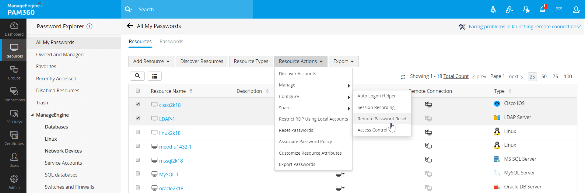 PAM360为您提供远程更改资源密码的功能。 在PAM360中,通常可通过命令行界面( CLI ) 访问的设备都可以进行远程密码重置和密码管理。