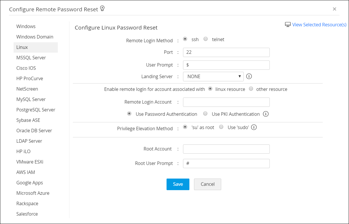 这些资源不需要特定的密码重置配置,因为 PAM360 将使用添加到资源中的帐户来执行密码重置。