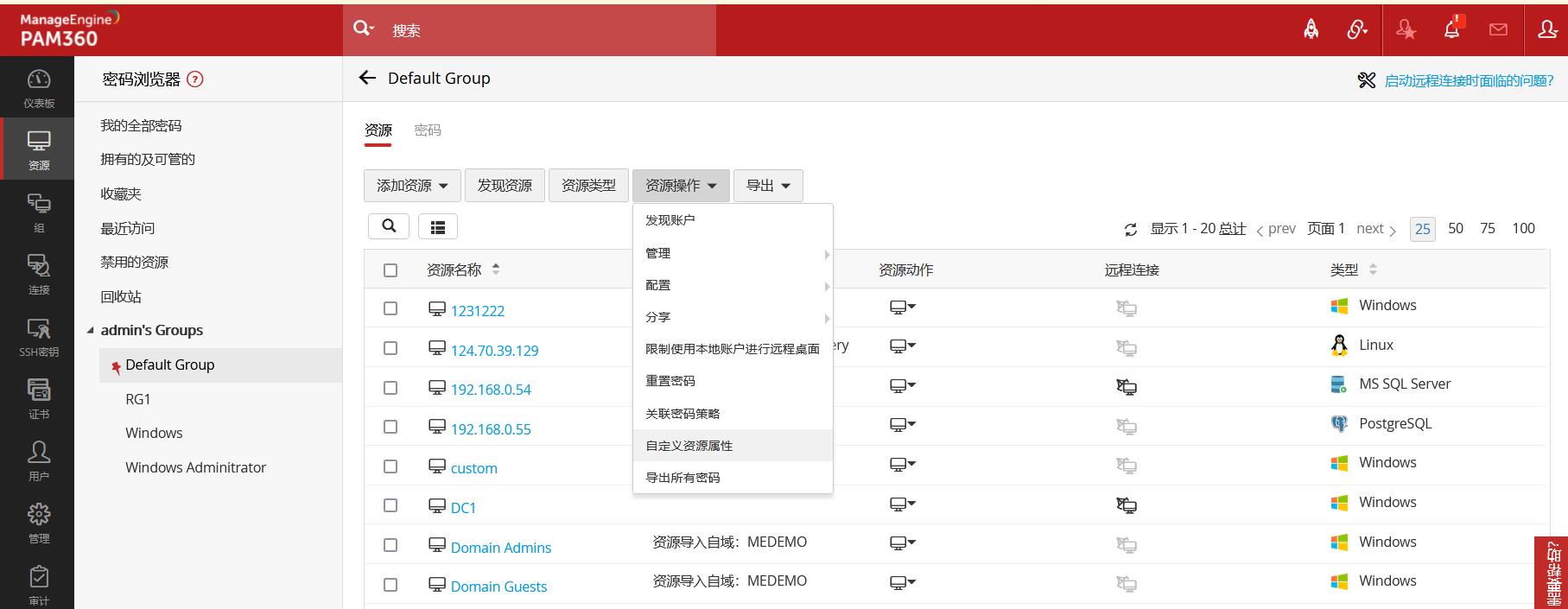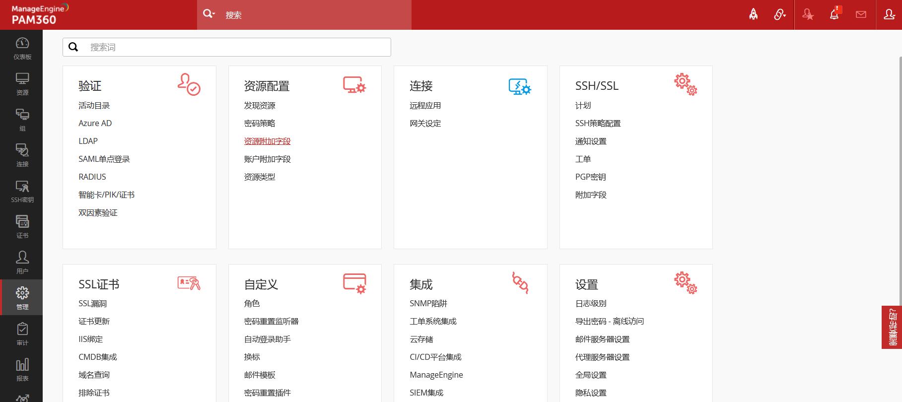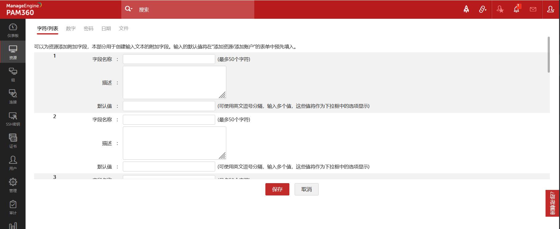 PAM360允许您在账户和资源管理中使用自定义字段,可以添加4种类型的附加字段,文本,数字,日期和邮箱。附加字段 被创建并赋值后,可以显示在如SSH 密钥以及证书页签等所有被应用的功能页面中,并且对所有用户可见。 在PAM360中创建动态组时,附加字段也可以排上用场,因为您可以使用存储的自定义值为组提供条件表达式。 您可以单独为资源和帐户创建20个自定义字段。
