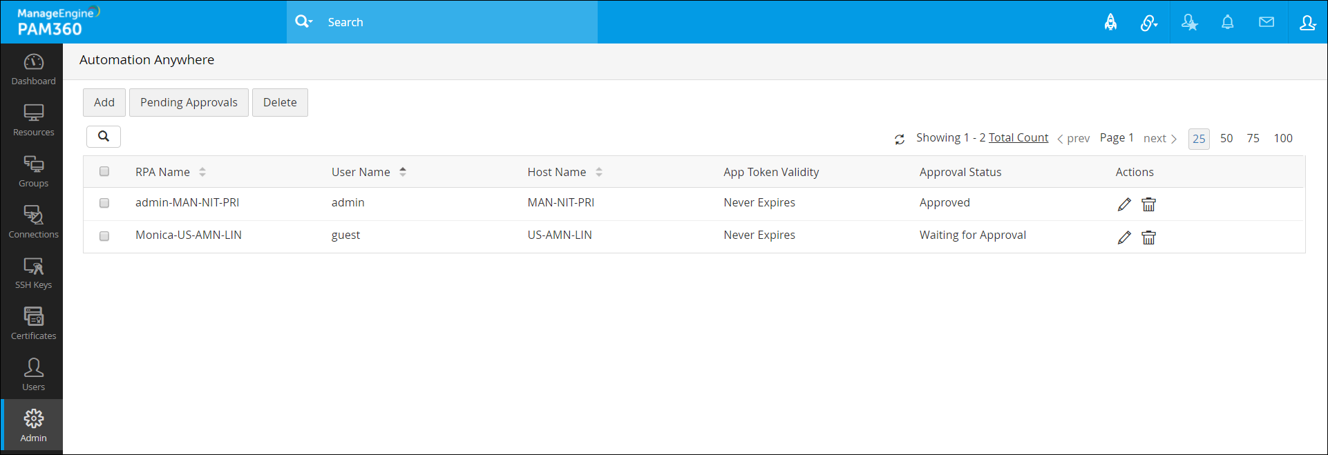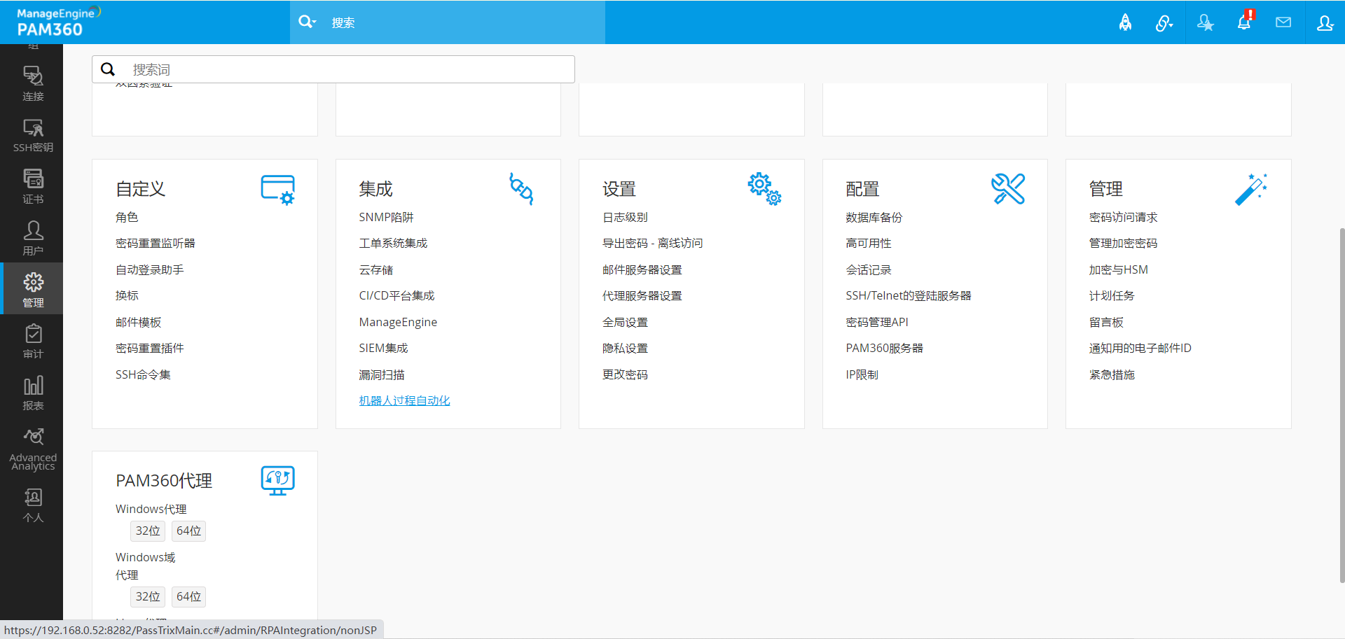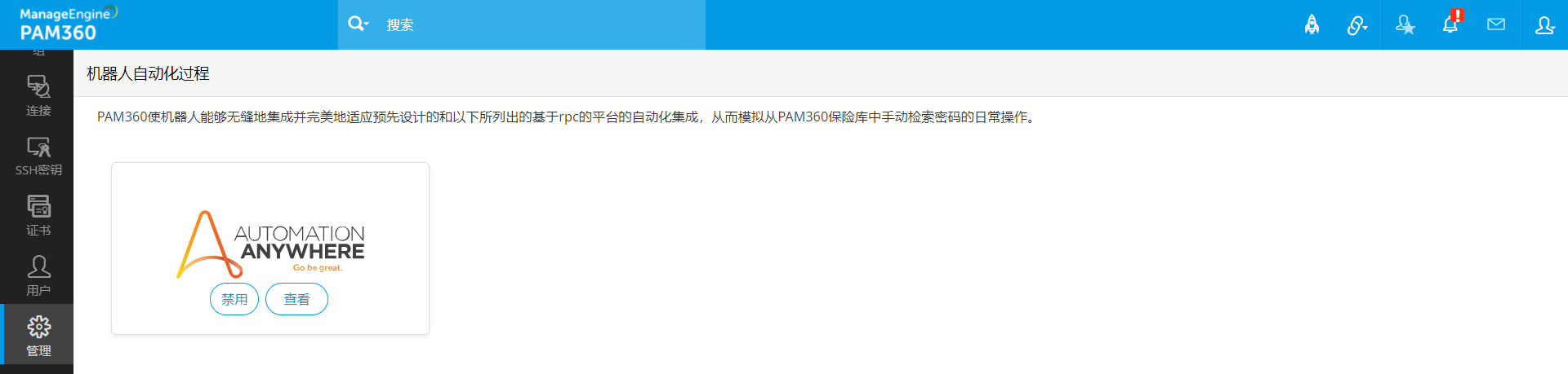 - 登录到PAM360的Web界面,然后切换到管理 >> 集成 >> 机器人过程自动化。