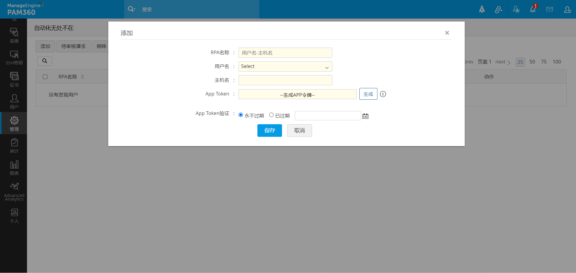 - 主机名称:输入主机名称,即生成的App Token被批准后,用户从哪里使用PAM360机器人。注意为一个唯一的用户名-主机名的组合仅允许一个对象。