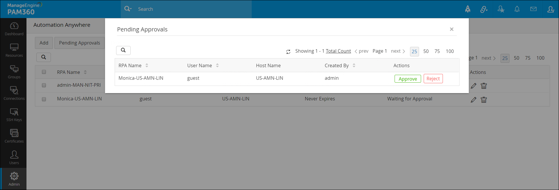 场景 II - 等待RPA授权的用户审批:如果RPA所有者具有RPA权限,那么审批请求将会发送给RPA所有者,他们将可以在挂起的请求下看到该请求,他们可以检查例如用户名称、主机名称、创建人等,然后执行批准或拒绝。批准后,RPA所有者可以选择生成新的App Token或者使用在添加对象时所生成的。但需要注意,仅RPA所有者可以应用App Token,在Automation Anywhere中使用PAM360机器人。如果拒绝了请求,RPA对象将从菜单中删除。