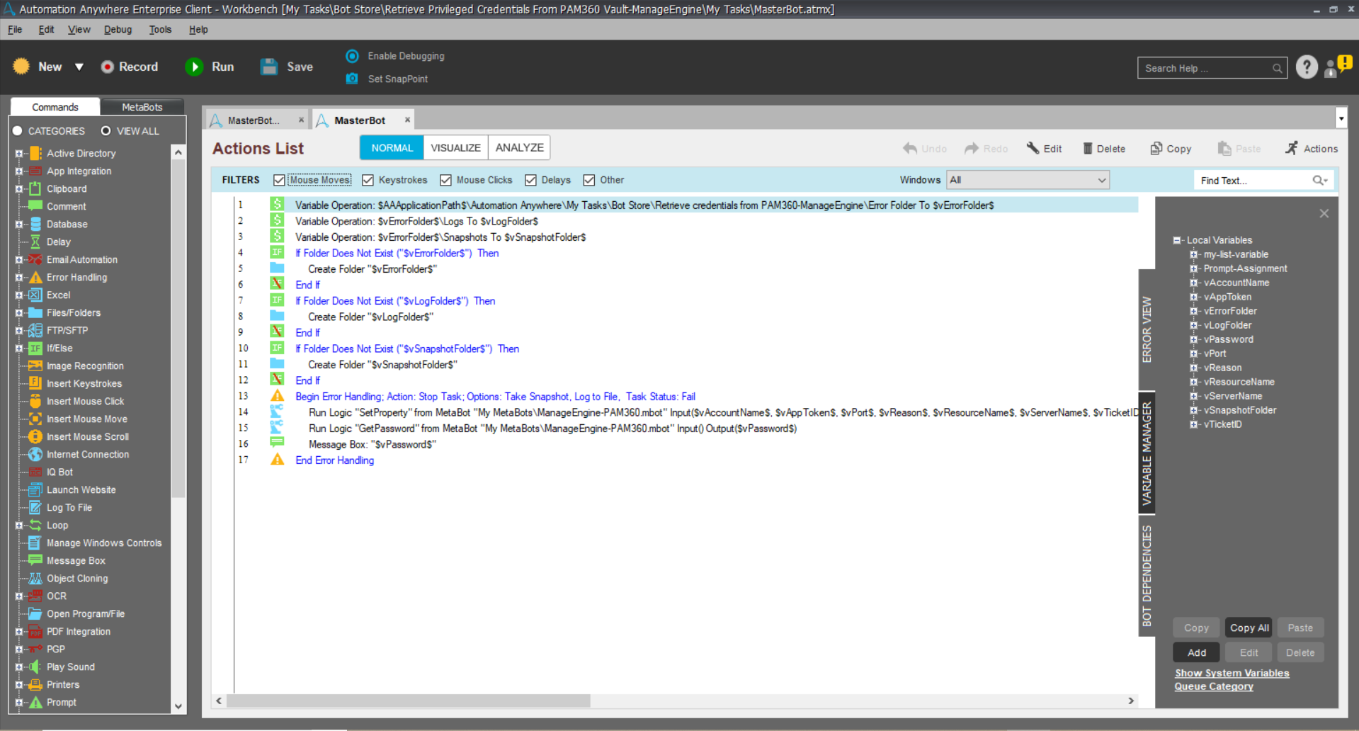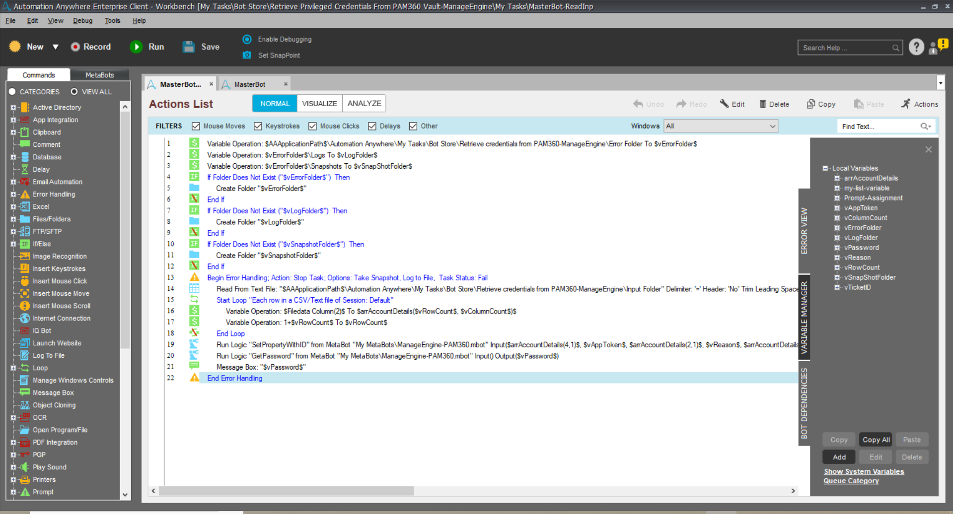 - MasterBot-ReadInputFromFile.atmx - 通过读取一个文本文件中的资源ID和账户ID来提取密码,该文件可从PAM360的Web界面下载。点击这里了解如何从PAM360下载账户明细。