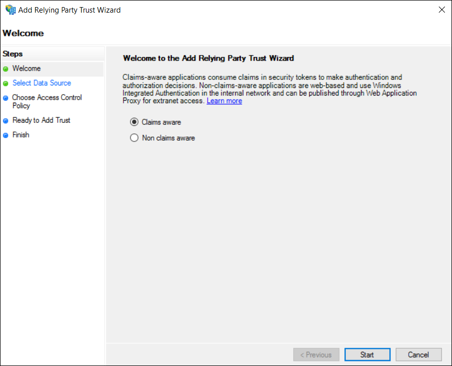 - 第一步是在AD FS 10.0中添加PAM360明细,在信任关系下,右键点击依赖方信任,并从下拉菜单中选择添加依赖方信任,页面将打开一个向导窗口,如下图所示: