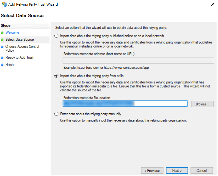 - 点击开始,继续执行下一步,点击选择数据源,然后选择第二个选项,从文件中导入有关依赖方的数据,点击浏览,导入之前从PAM360下载的XML文件,然后点击下一步。