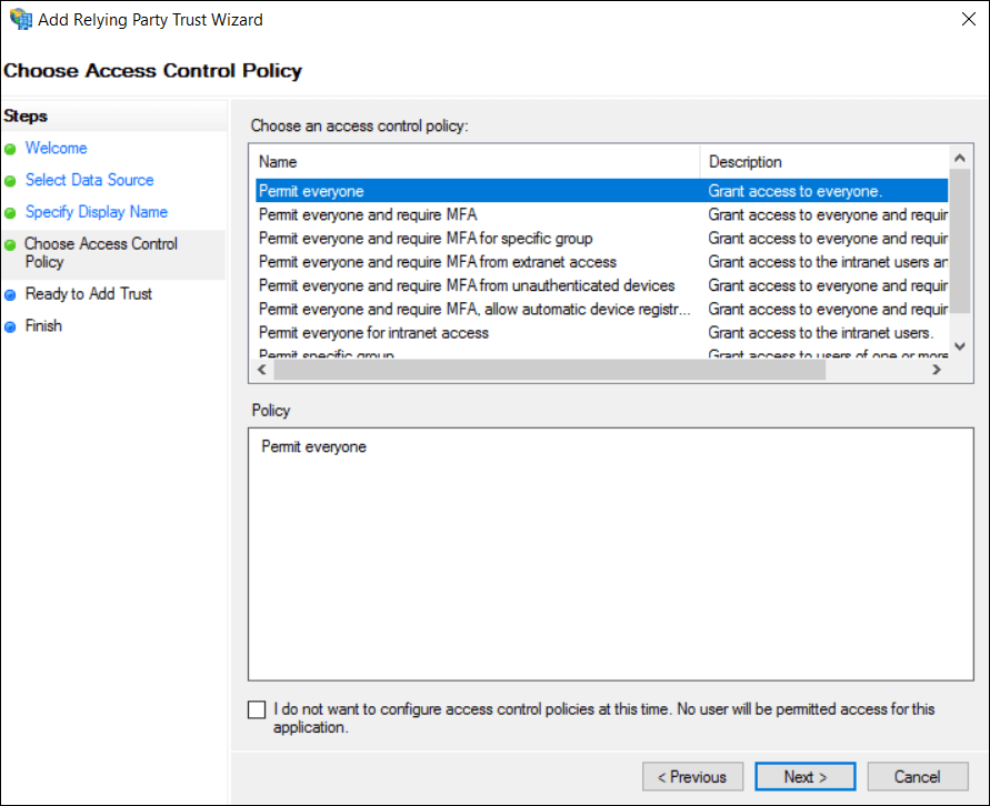 - 选择访问控制策略:请在这里选择第一个选项允许所有人并继续。