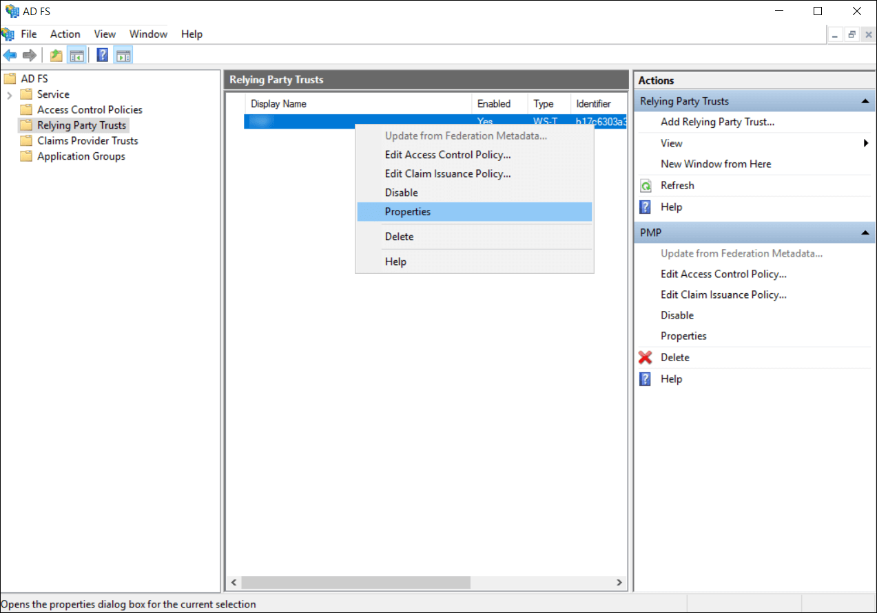 - PAM360现在将显示在"依赖方信任"列表中,右键点击该图标,然后从下拉菜单中选择属性,如下所示: