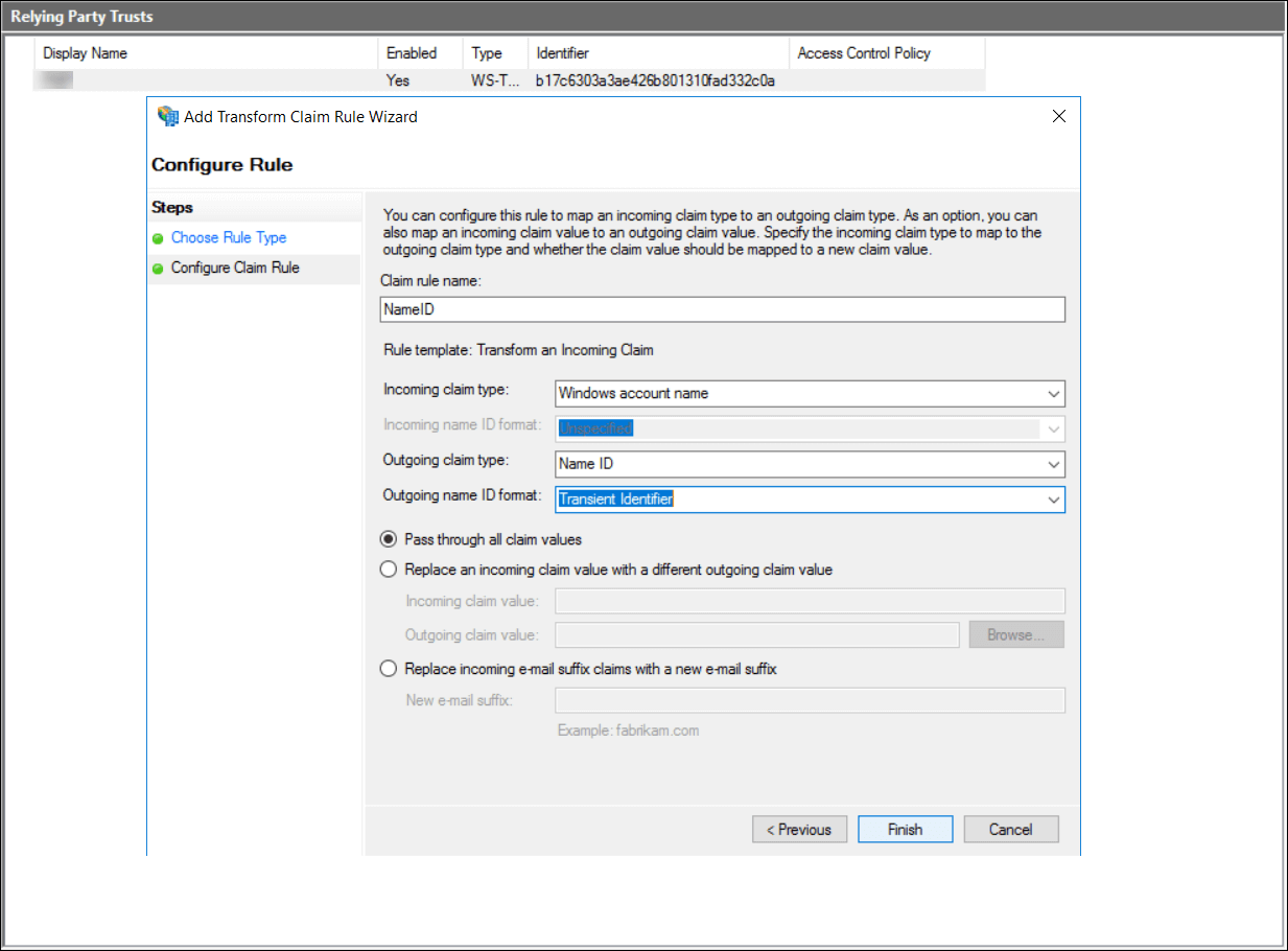 注意 :如果您已经从AD导入了用户到PAM360,那么他们的登录名将以“域名\登录名”的格式存储。 默认情况下,将'Windows帐户名'设置为传入的声明类型将与此格式进行匹配。但是,如果您通过CSV文件导入为AD用户创建了PAM360本地帐户则需要选择与 PAM360 中存储的登录名格式相匹配的其他声明类型。