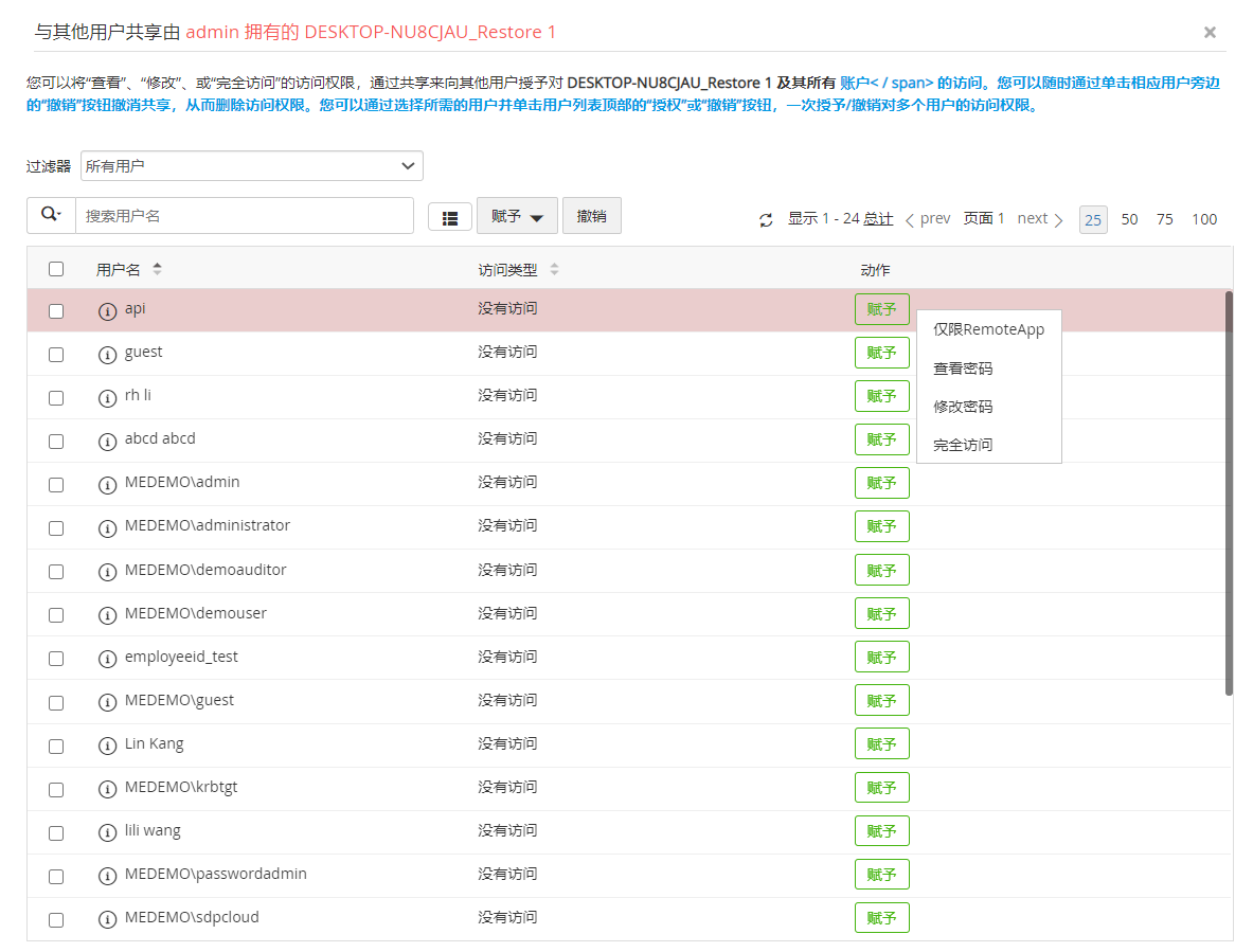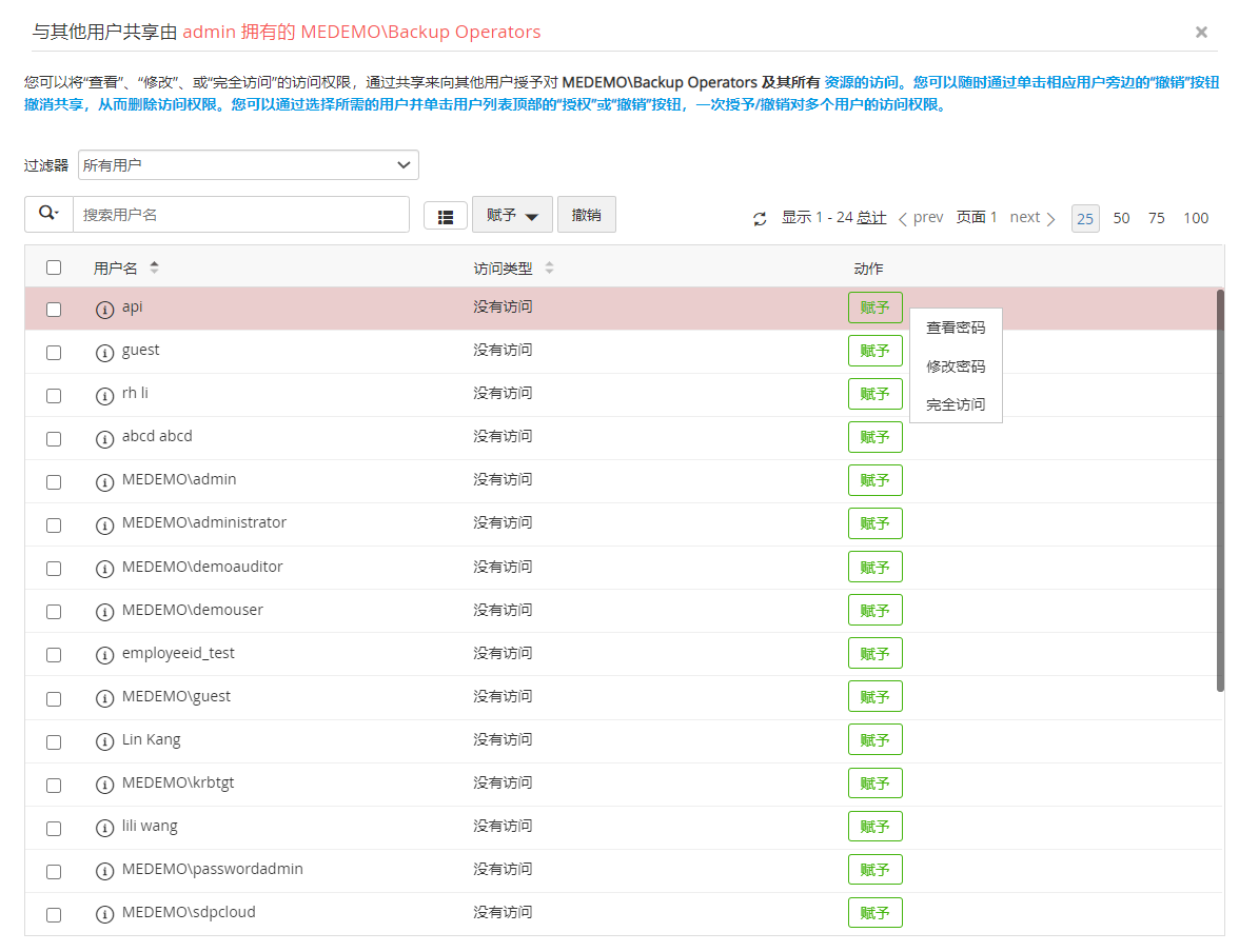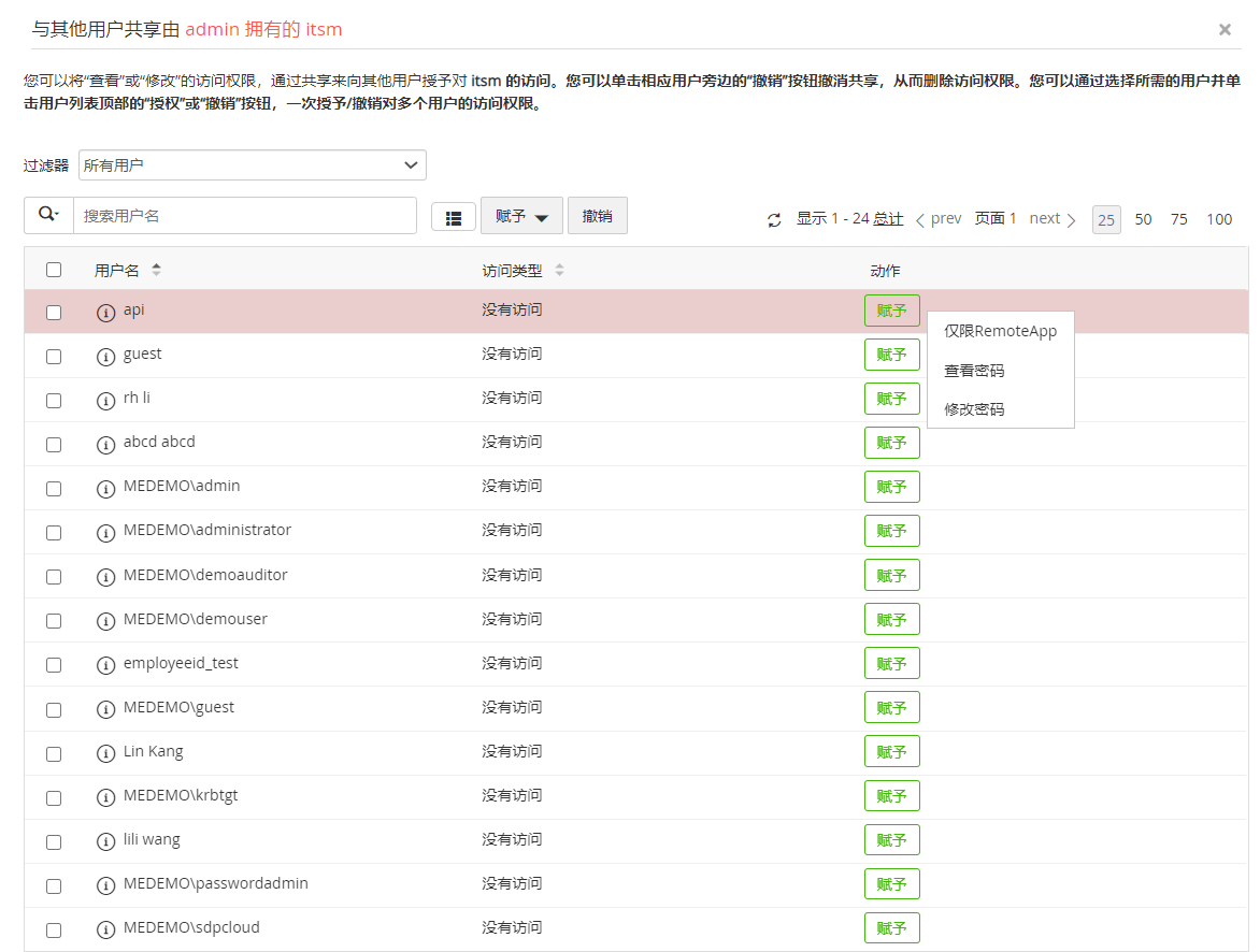 - 在弹出框中,点击要与该帐户共享的用户/用户组旁边的"赋予"选项,选择查看密码、修改密码或完全访问,然后点击保存。