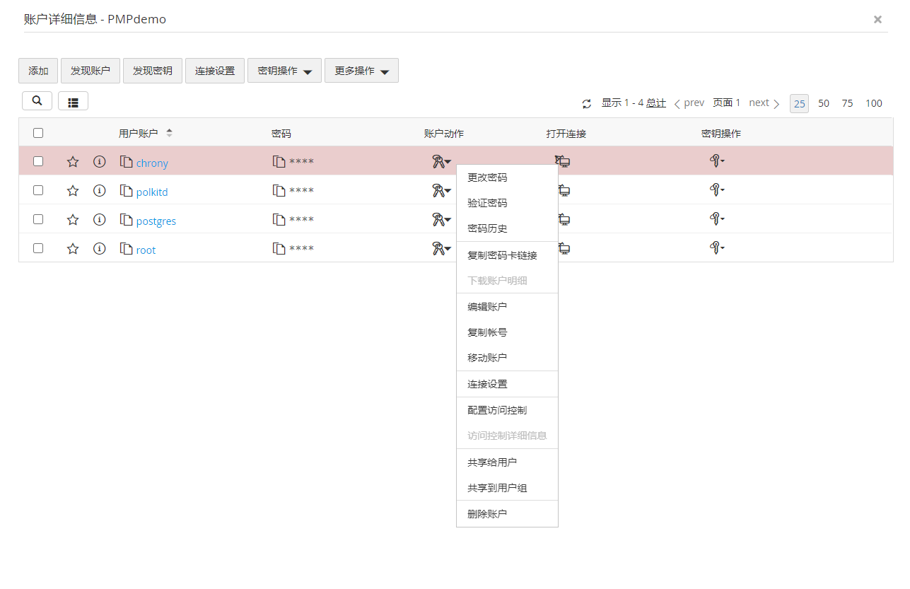 PAM360支持您与其他用户/用户组共享您的个人资源/资源组。 当资源被共享时,该资源的所有密码都会被共享。 您通过选择不同的级别,为使用密码的用户和用户组授予不同的权限。