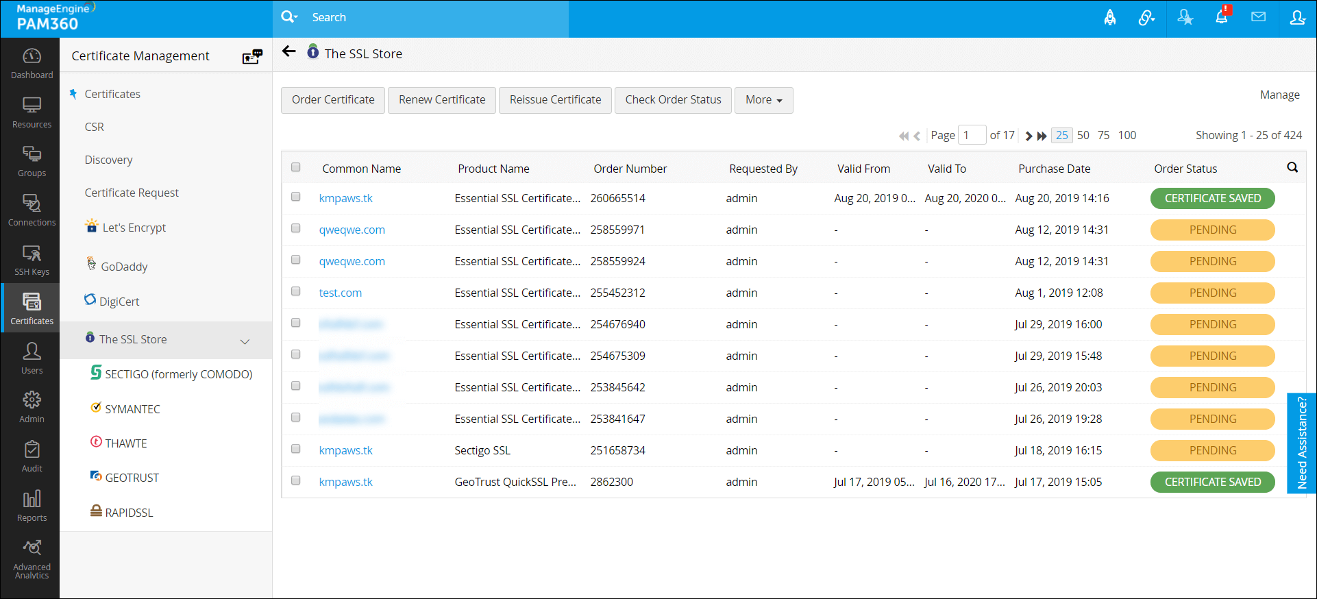 通过 PAM360 与The SSL Store ™ (世界范围内知名证书机构的平台合作伙伴)的无缝集成,您将可以选择直接使用 PAM360,管理来自Sectigo (Comodo)、Symantec、Thawte、 Geotrust和RapidSSL的证书。