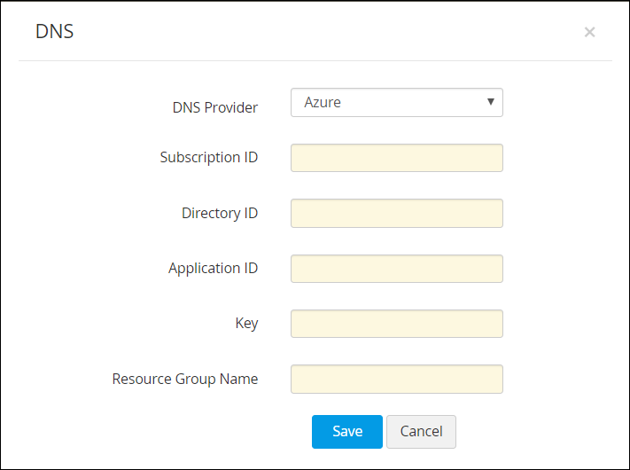 - 在打开的弹出窗口中,选择质询类型为dns-01指定域名,选择 DNS 供应商( Azure 、 Cloudflare 或 Amazon Route 53 DNS )并输入服务器详细信息。