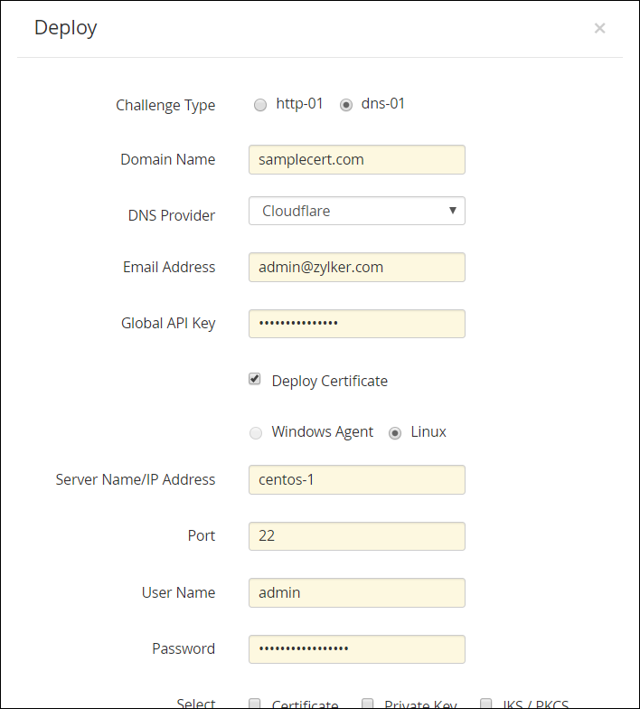 - 在打开的弹出窗口中,选择质询类型为http-01,指定域名,选择服务器类型(Windows 或 Linux )并输入服务器详细信息。 单击保存。