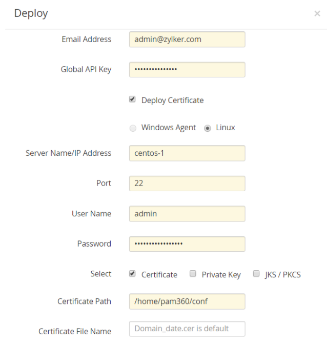 - 另外,如果在“管理 >> 部署”下配置服务器详细信息时启用了“部署证书”选项,则证书在颁发后会自动部署到其相应的终端服务器 。