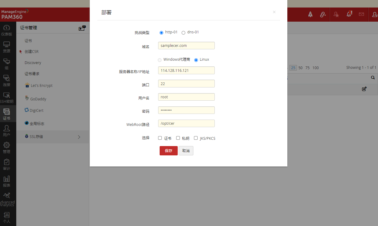 - 在域验证成功后,证书颁发机构会颁发证书并添加到PAM360的证书选项卡中,同时部署在管理>>部署的服务器指定路径中。