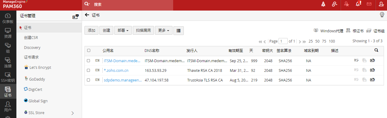 PAM360扫描其存储库中的SSL证书,并标记容易受到漏洞影响的证书,使用户随时了解不安全的证书/服务器配置。帮助用户采取必要的补救措施,替换或更改SSL证书或服务器配置。