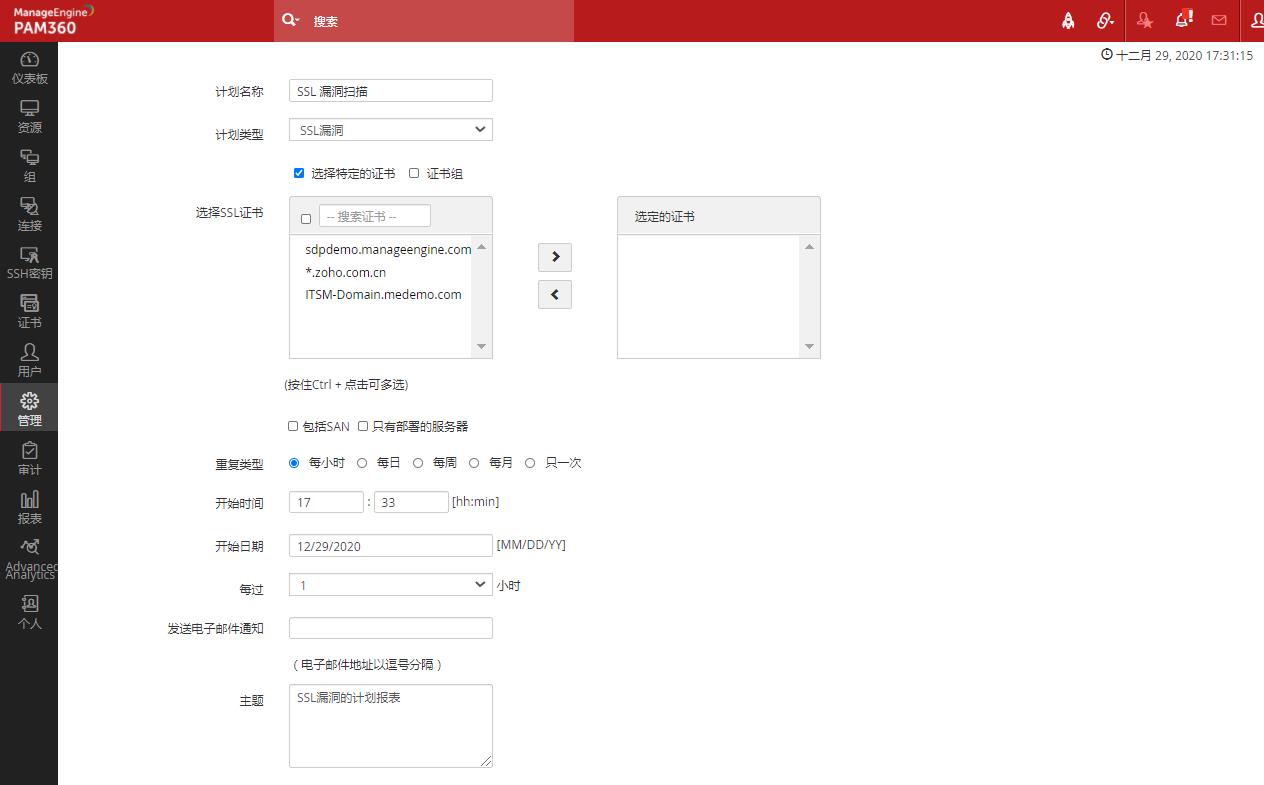 - 另外,您可以使用PAM360安排SSL证书的自动定期漏洞检查,并在测试完成时选择向管理员发送电子邮件通知。