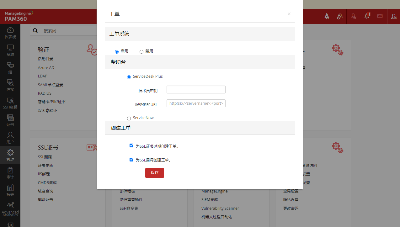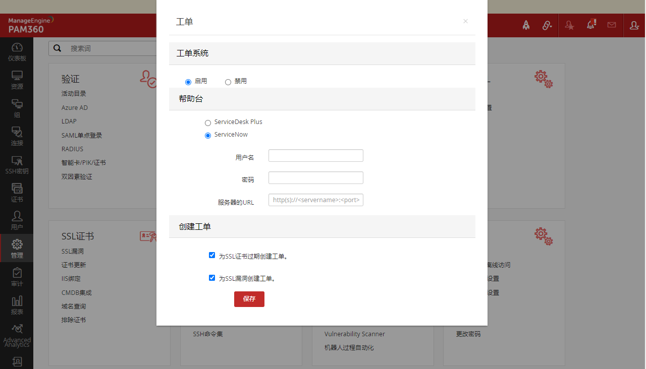 若要启用SSL证书与工单系统的集成,需输入工单系统在PAM360运行的机器上所可以访问的服务器URL。
