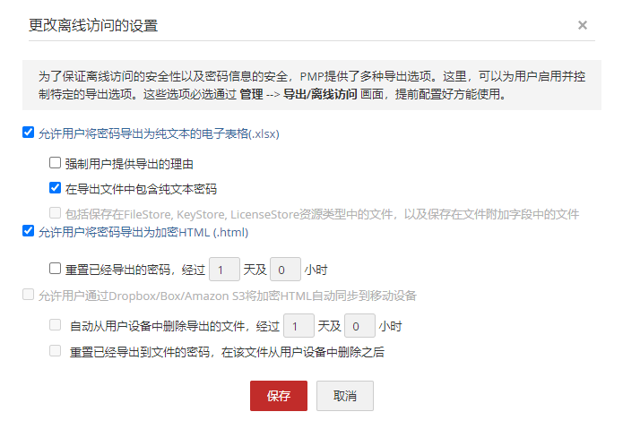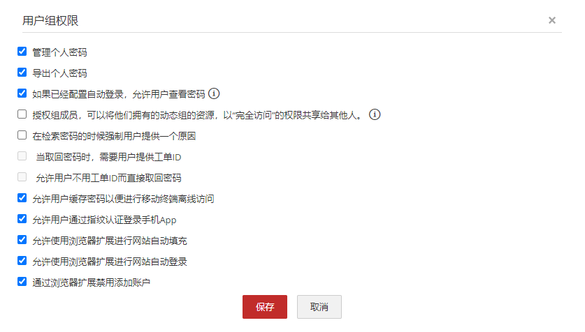 - 导出个人密码:启用此选项可允许组用户导出存储在个人选项卡中的个人密码。 如果不希望用户组的用户使用密码导出,请取消选择此选项。