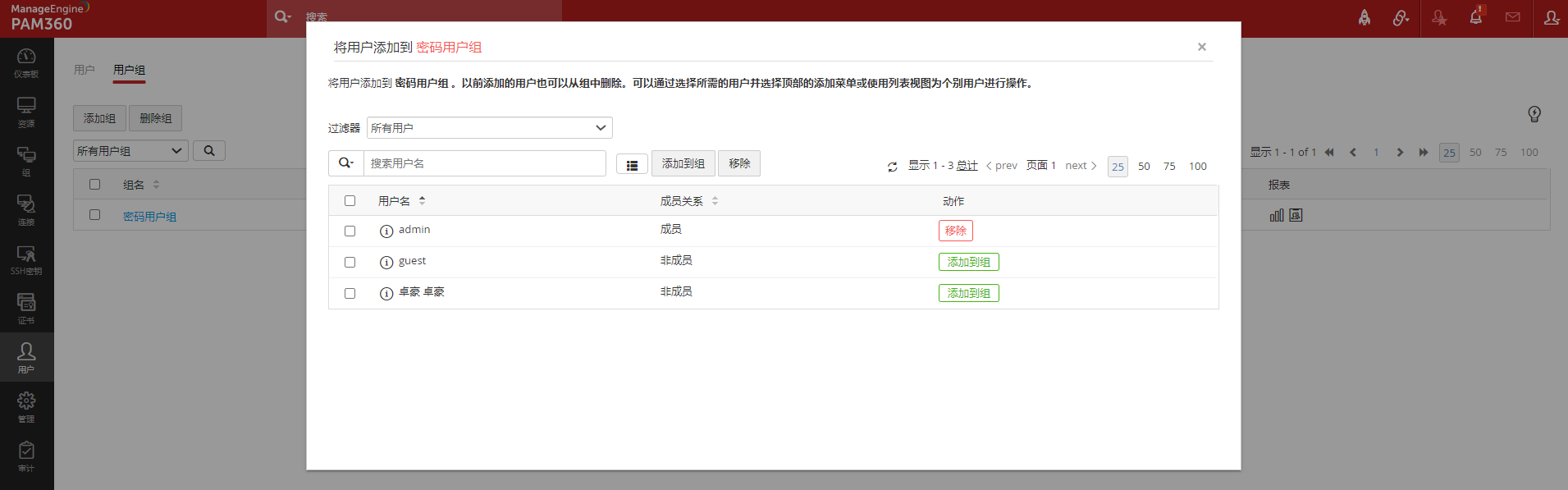 按照以下步骤编辑现有用户组添加用户或删除已有用户: