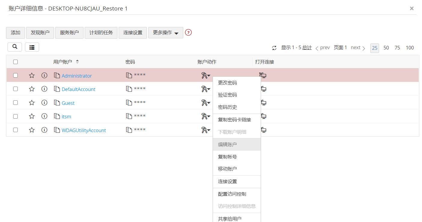 - 点击 Windows 域资源名称,在打开的界面中,点击服务帐户的帐户操作图标,然后从下拉列表中选择编辑帐户。