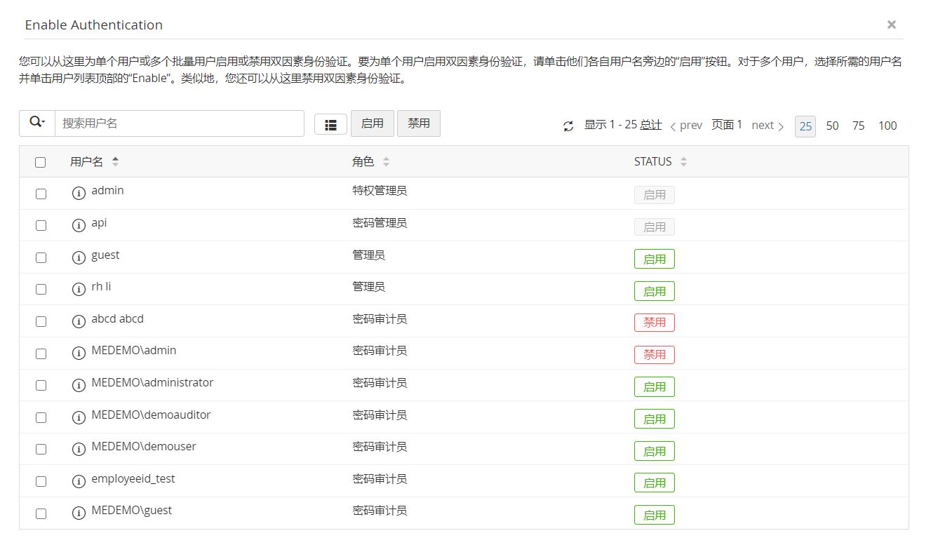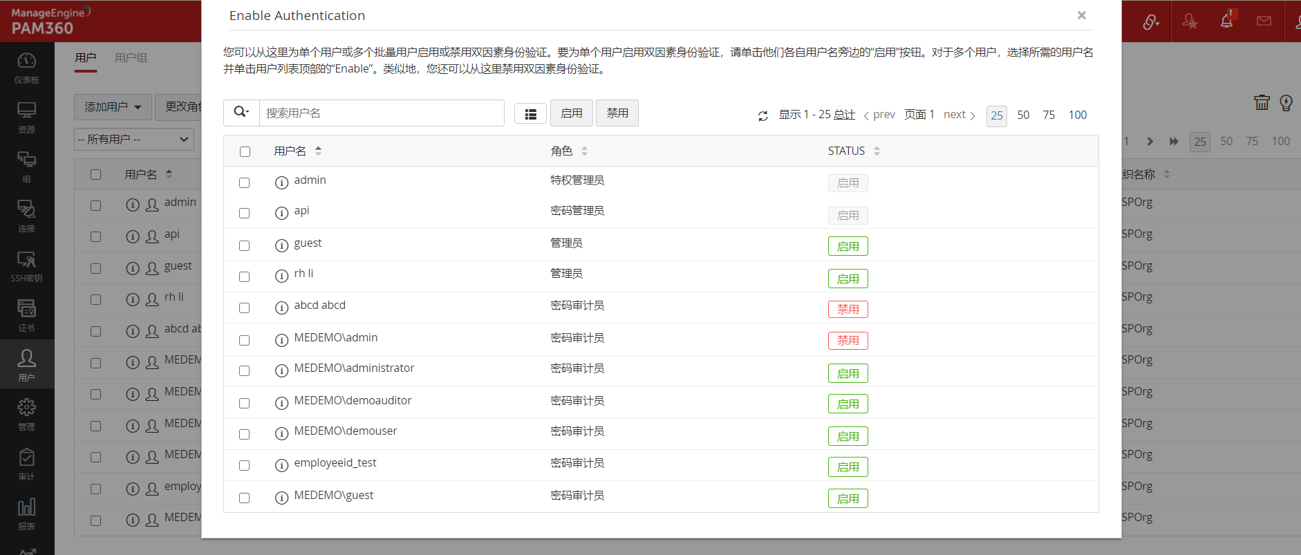 - 您可为单个用户或批量为多个用户启用或禁用双因素验证。 为单个用户启用双因素验证,请单击相应用户名旁边的启用。 为多个用户启用,请选择所需的用户名,然后点击用户列表顶部的启用。 类似的,您也可以禁用双因素验证。