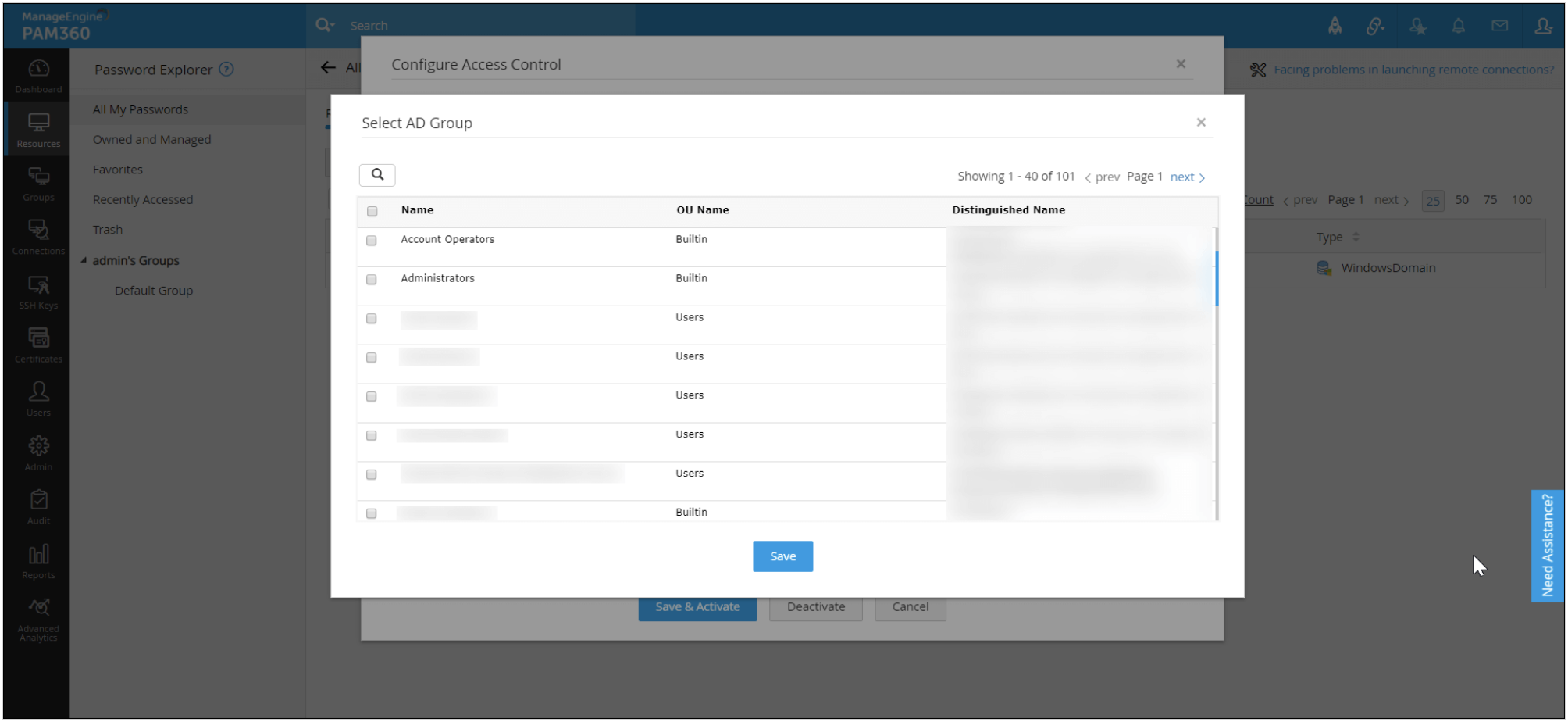 PAM360与ADManager Plus的集成使管理员能够控制将域用户帐户映射到Active Directory中的特定安全组。这可以通过在PAM360中将Active Directory域控制器添加为资源,然后将其与选定的Active Directory安全组相关联来完成,这些组由于这些产品之间的集成而获取和显示。