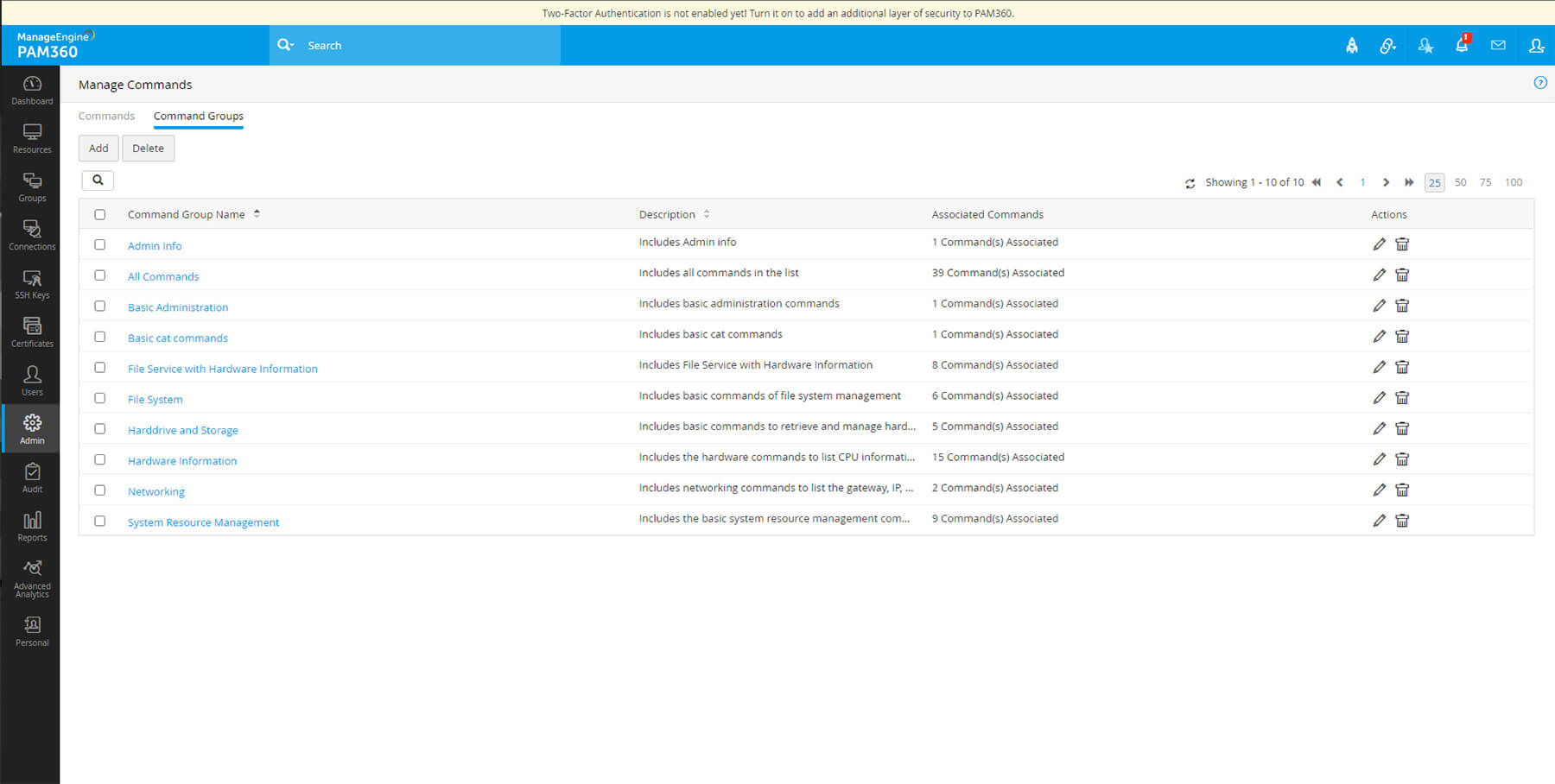 PAM360提供与所有特权提升活动相关的端到端审计,例如安装Linux代理、命令允许列表和分组、未经授权的命令执行、配置自助服务特权提升、使用“pamelevate”特权运行命令等。