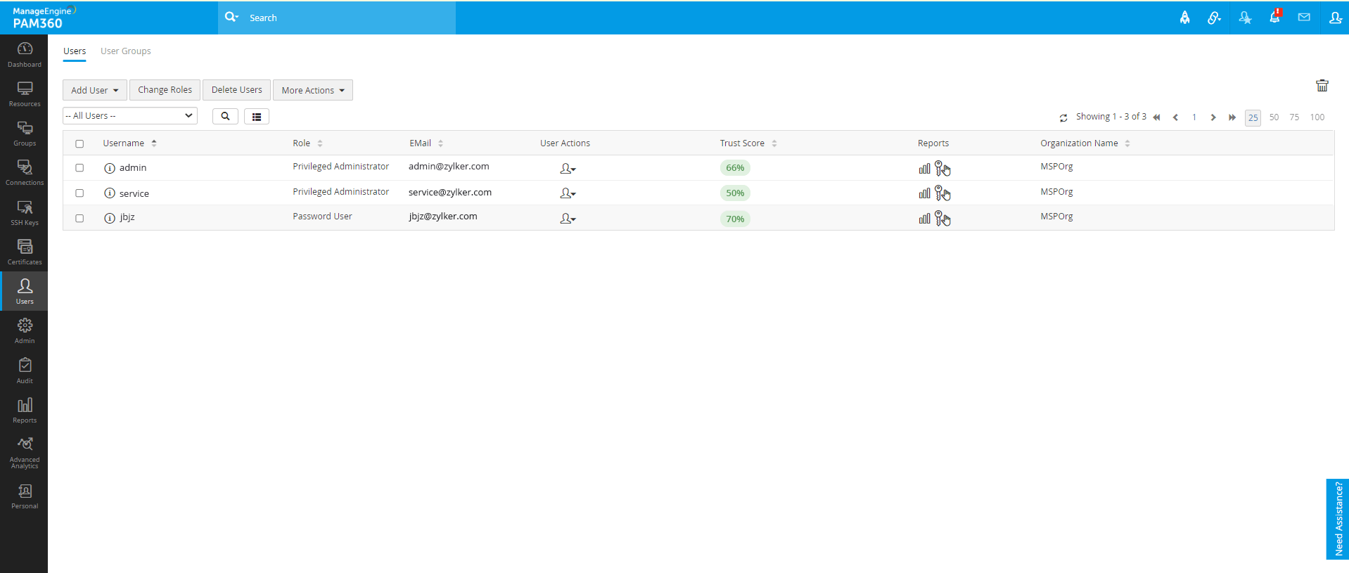 当异常活动在筒仓中发生时,往往会被忽视。这些活动可能包括从多次失败的登录尝试到从未经授权的IP位置访问。虽然这种孤立的事件可能不会自行升起任何危险信号,但当齐声地看待时,它们会让人感到担忧。如果没有正确的方法,很难将潜在威胁与特权用户执行的有效行动相区分。PAM360的信任评分通过帮助企业采用自适应的零信任方法进行特权访问管理来解决这个问题。