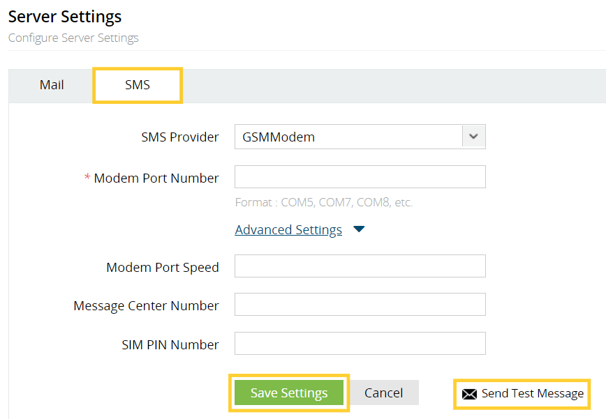 Steps to configure ADAudit Plus to use a GSM Modem as an SMS provider: