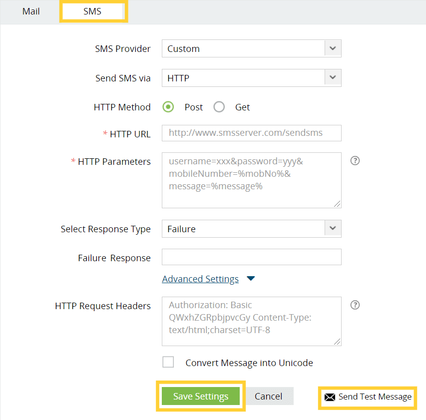 - If the SMS provider expects unicoded messages, check Convert Message into Unicode.