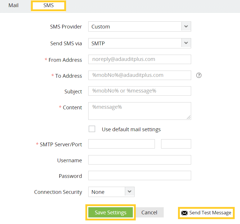 Steps to configure ADAudit Plus to use a custom SMS gateway: