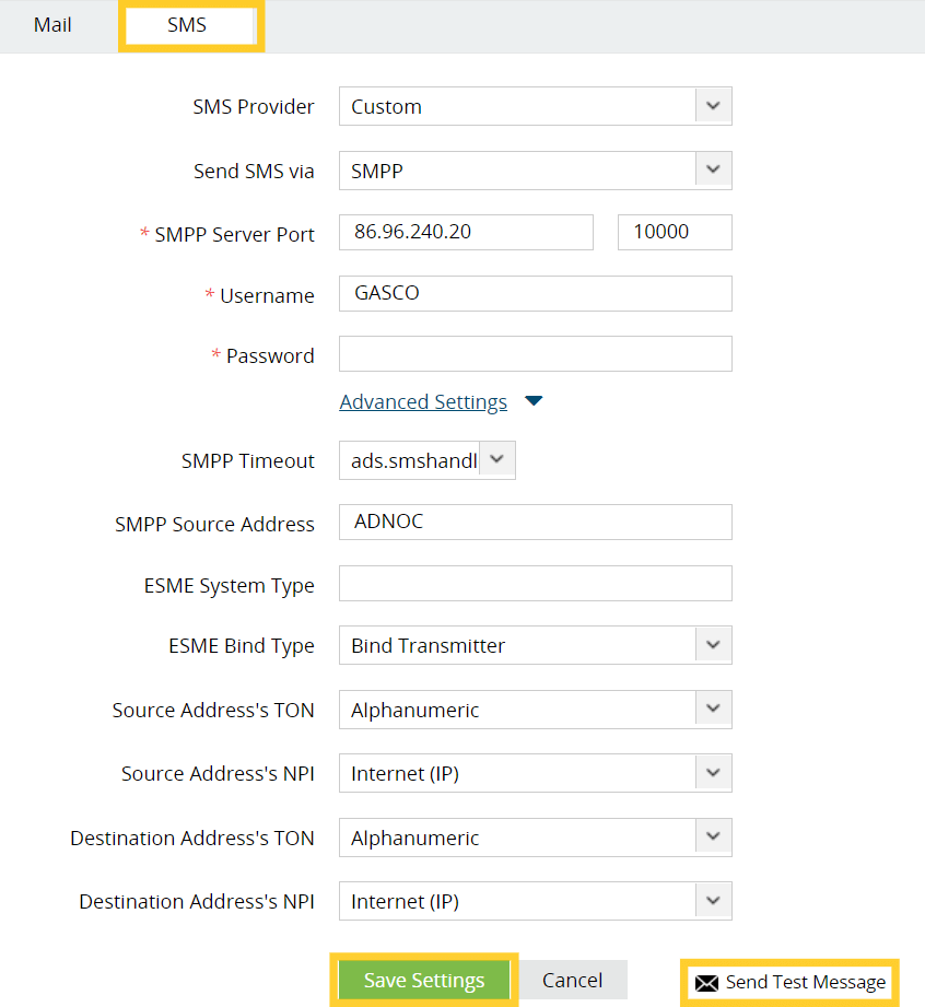 - Select the Source Address’ TON, Source Address’ NPI, Destination Address’ TON, and Destination Address’ NPI from their respective drop-downs.