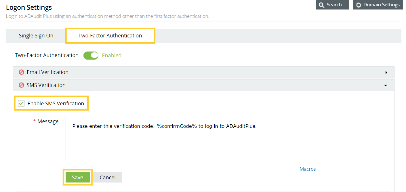 If you're enabling SMS Verification as a 2FA method, you can configure ADAudit Plus to use a GSM Modem for sending SMS notifications, or you can configure your own custom SMS gateway.