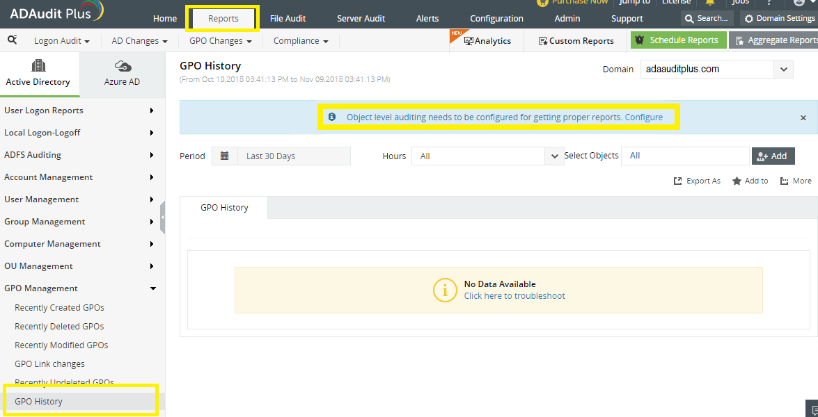 自动对象级审计配置可以通过以下方式完成:登录ADAudit Plus web控制台;&rarr报告;GPO管理;GPO历史需要配置对象级审计以获得适当的报告:Configure.