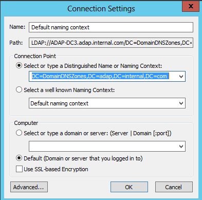 - 键入 DC=DomainDNSZones,DC=adap,DC=internal,DC=com 作为可分辨名称。