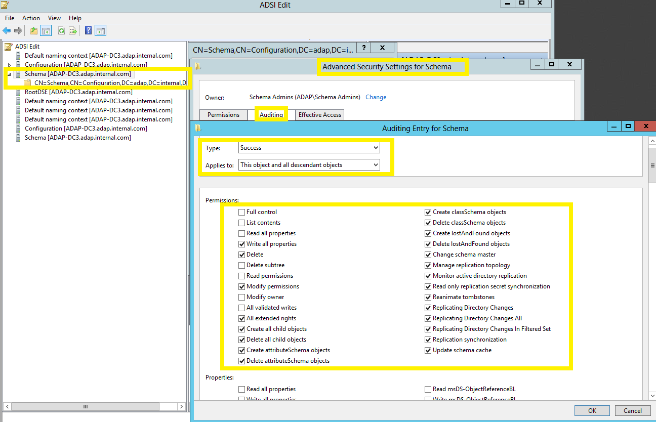 - 导航到左侧面板 →单击“架构”→右键单击“架构命名上下文”→“选择属性”→“安全”→“高级”→“审核”→“添加”。