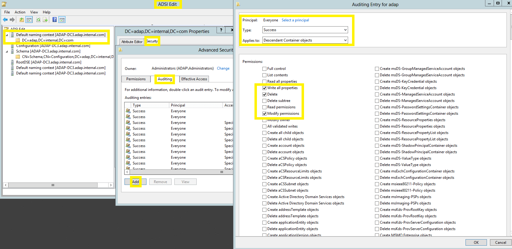 - 导航到左侧面板 → 单击“默认命名上下文”→右键单击“域可分辨名称”→选择属性→“安全”→“高级→审核”→“添加”。